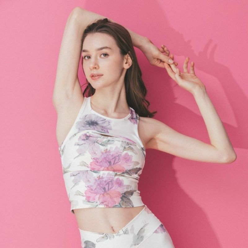 リジーオリジナルのプリントブラトップ。長めの丈感で露出を控えつつお腹周りをカバーしてくれます。柔らかく伸びのよいストレッチ素材でなめらかな着心地です。大きめの花柄を淡いピンクに仕上げたエレガントなフラワープリント。