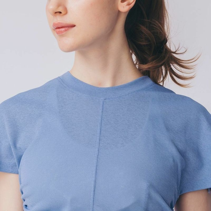 素材…ムラのあるシアー感が魅力のジャージー素材。ストレッチがあり、ソフトで柔らかな風合いです。環境に配慮したリサイクルポリエステルを使用しています。