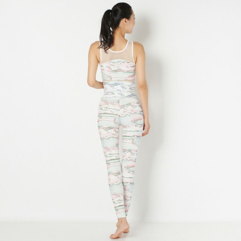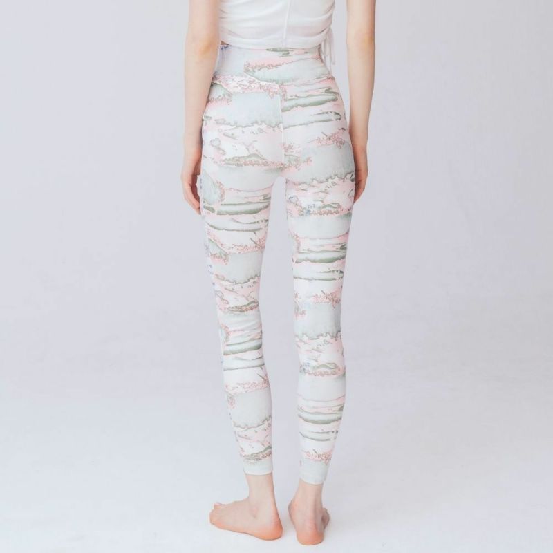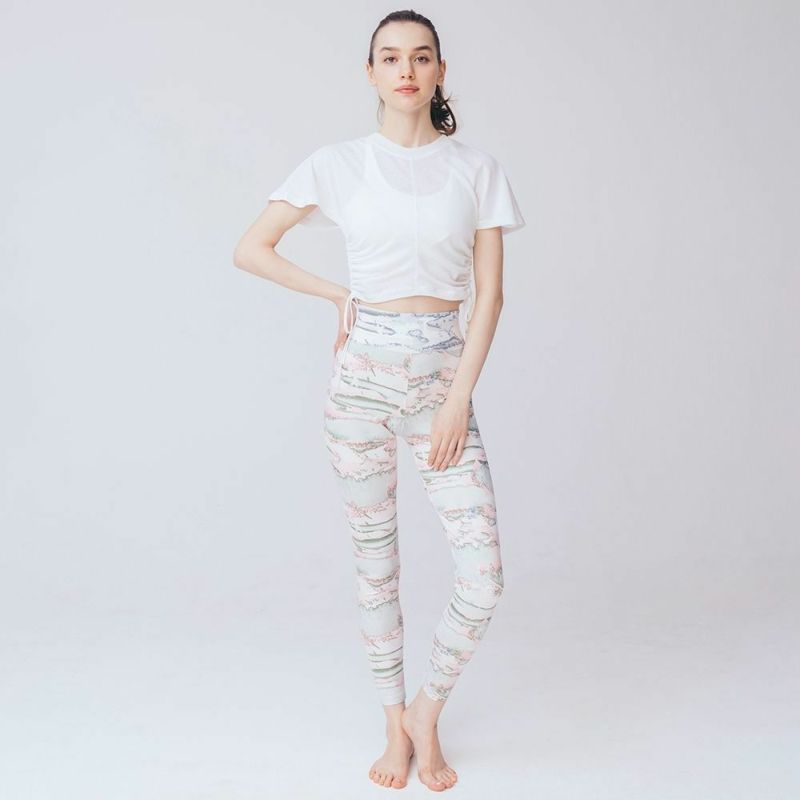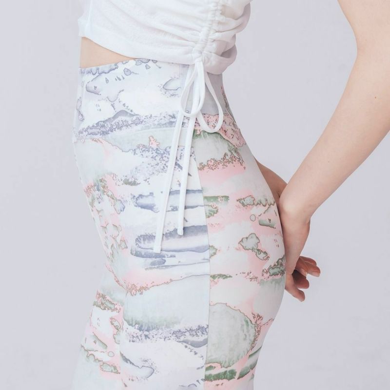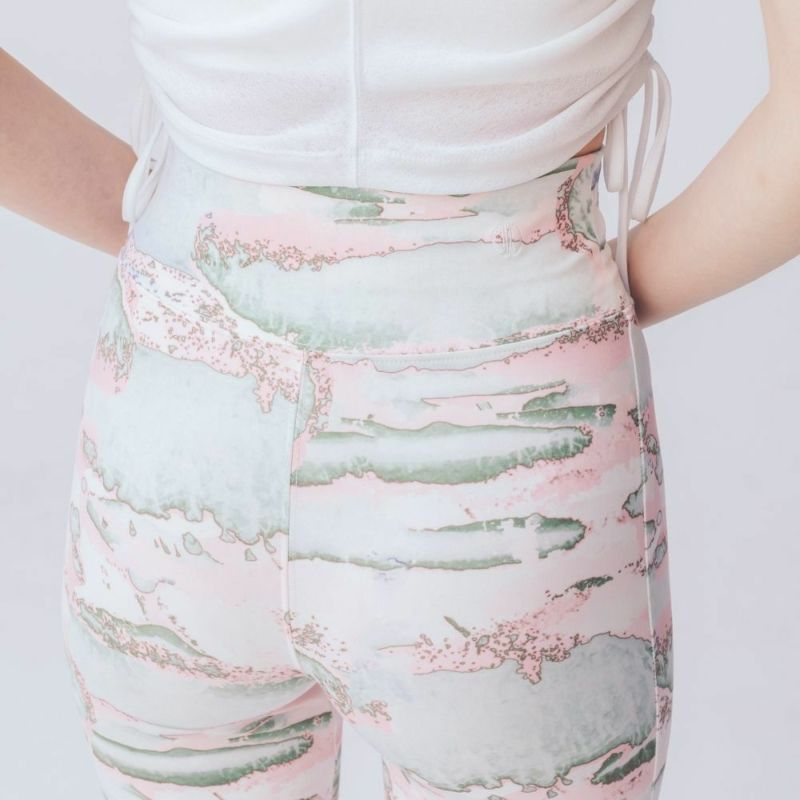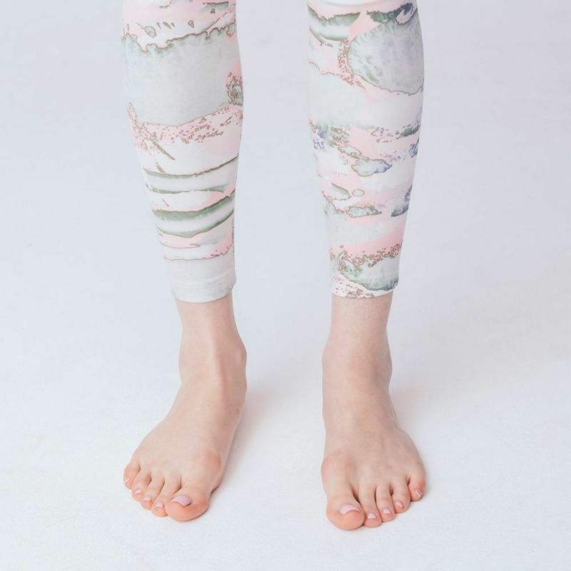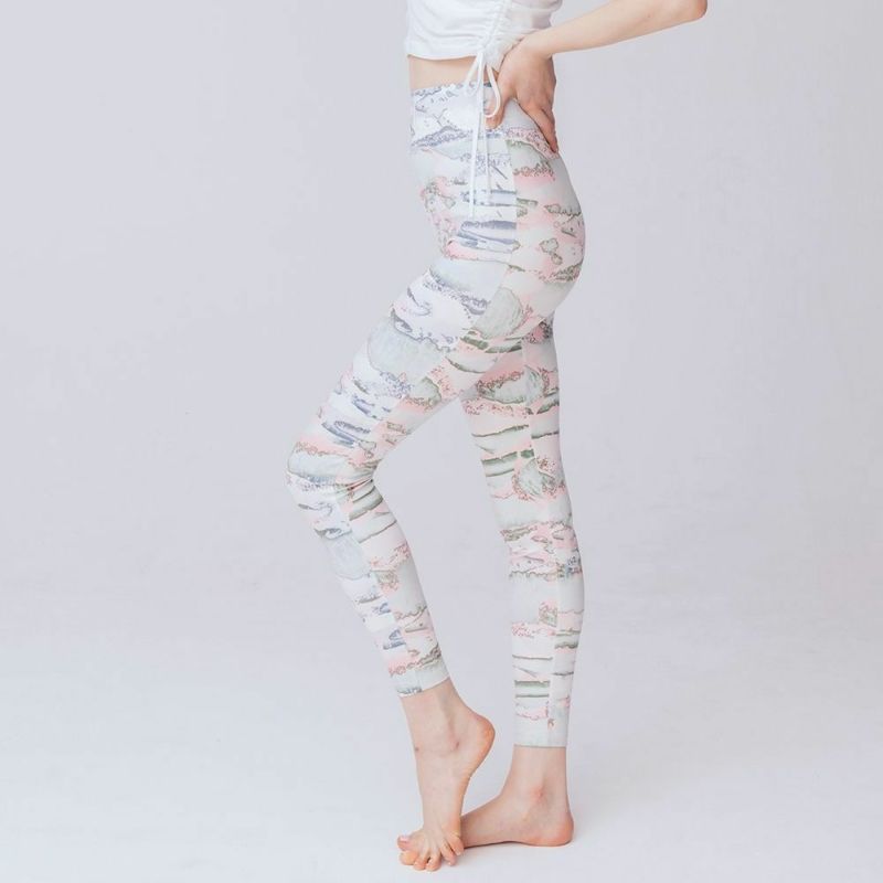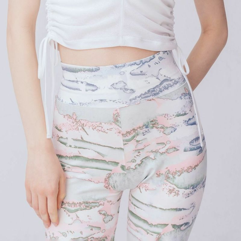 リジーオリジナルのプリントレギンス。柔らかく伸びのよいストレッチ素材でなめらかな着心地です。ハイウエストでしっかりとお腹周りもカバー。ニュアンス感のあるパステルピンクが春らしいミスト柄プリント。