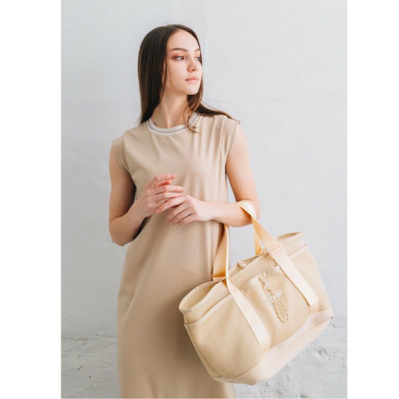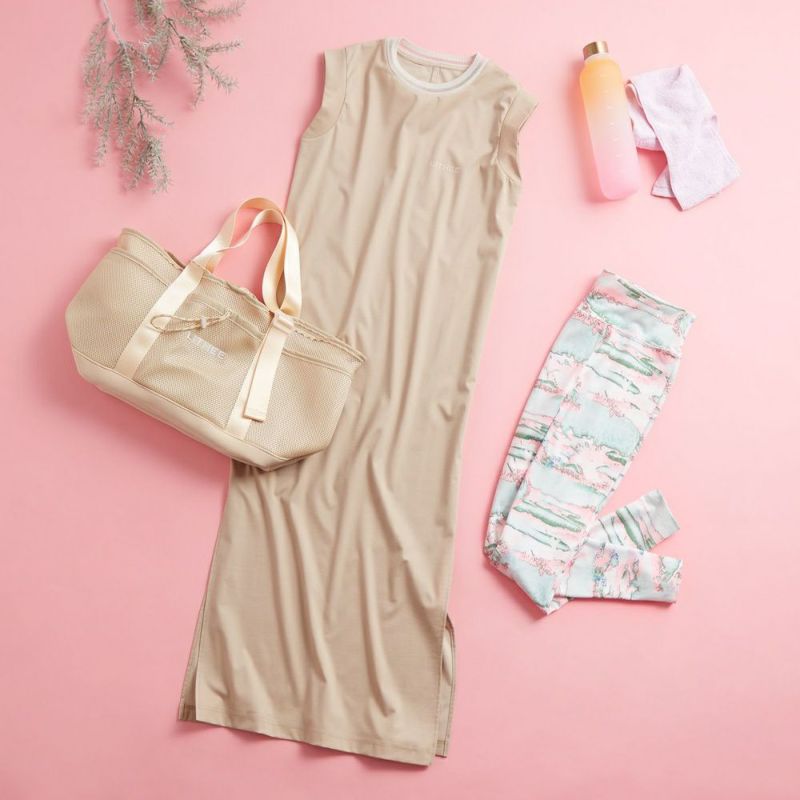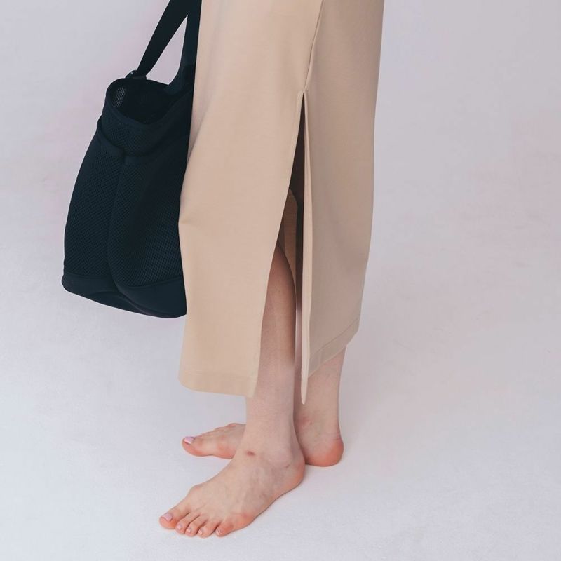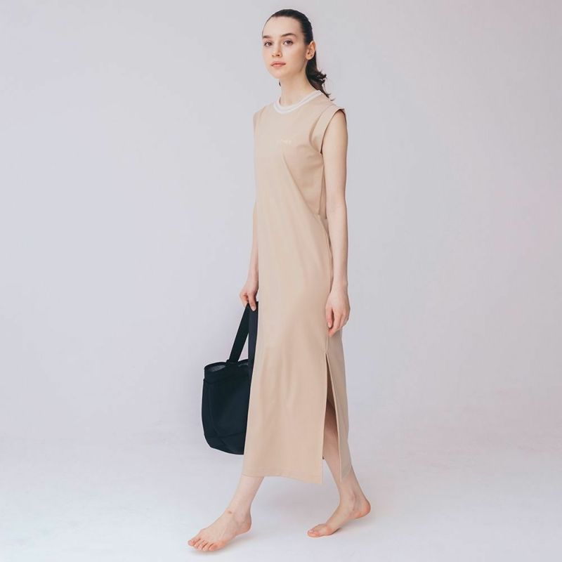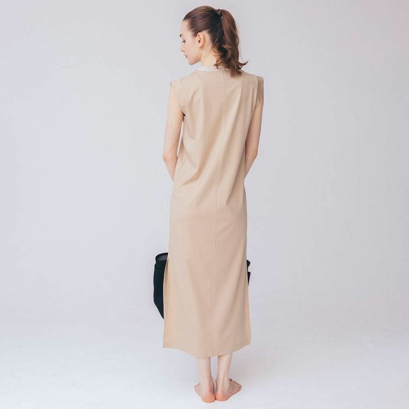 サイドにスリットの入ったノースリーブワンピース。肩の生地を少し出すことで、気になる肩回りをカバーしてくれます。ロング丈で普段着はもちろん、レッスンの行き帰りにヨガウェアの上にさっと着られる便利なアイテムです。微光沢のあるなめらかな生地で上質な素材感。ストレッチがあり、少しひんやりとした生地感なので、暑い時期も涼しく過ごせます。デザインはDOUBLE STANDARD CLOTHINGが監修しています。