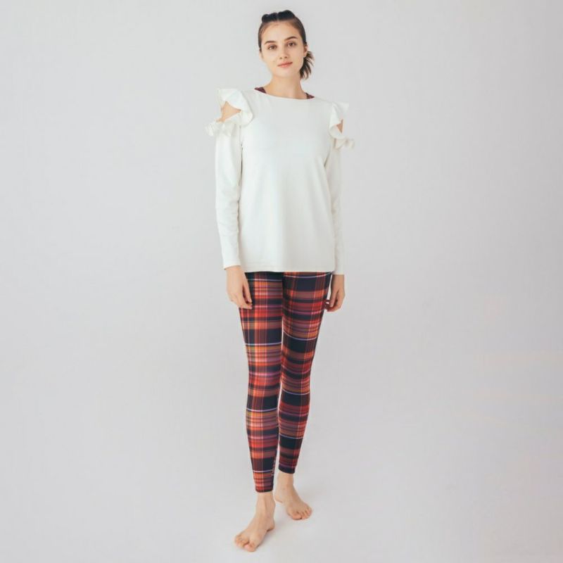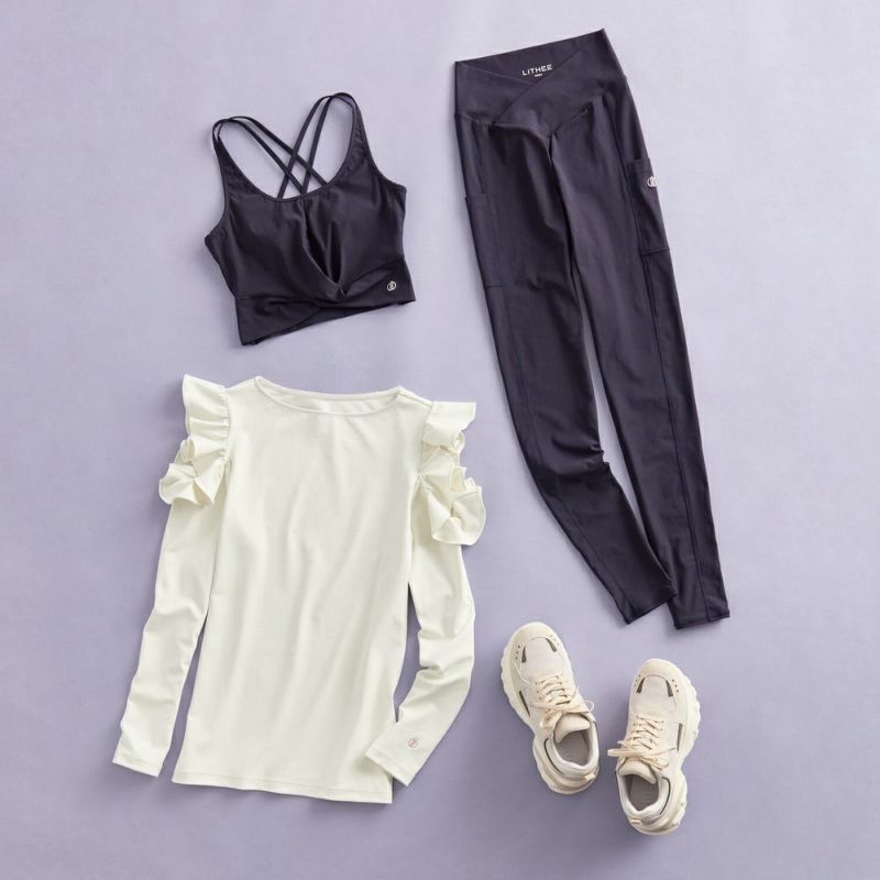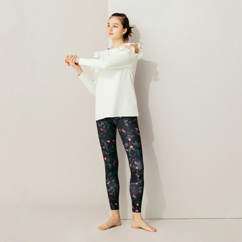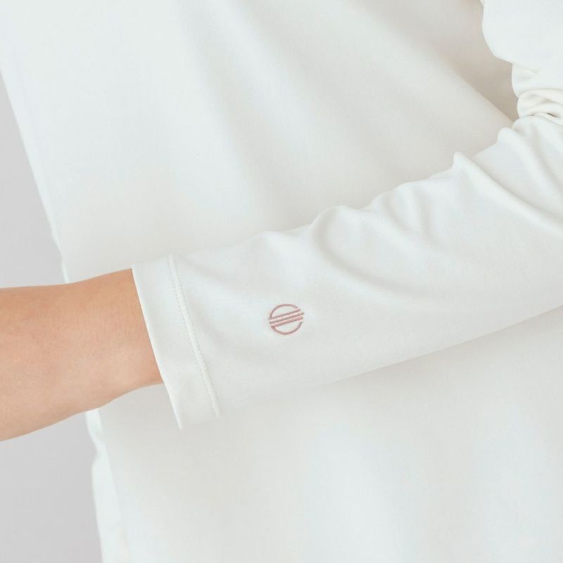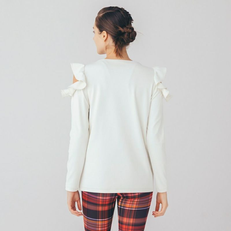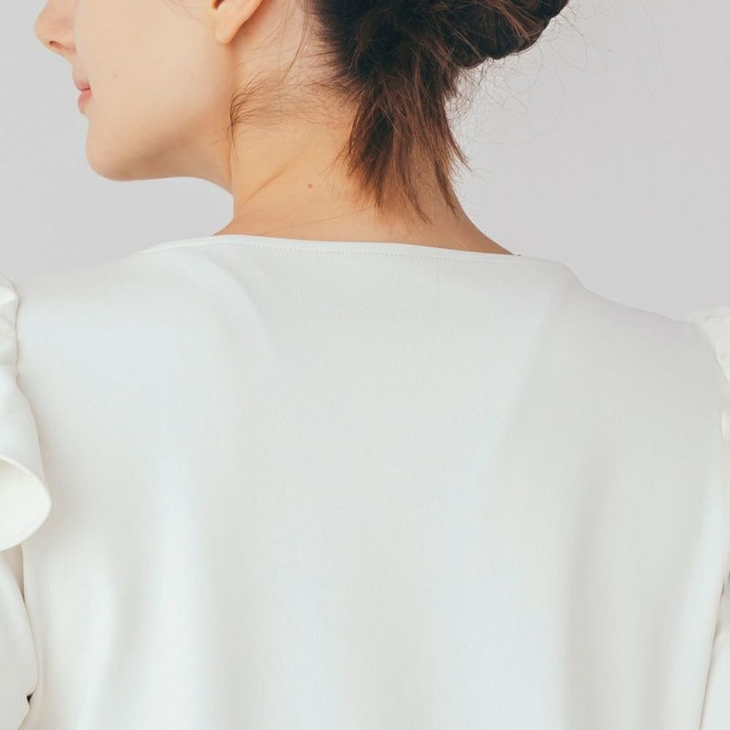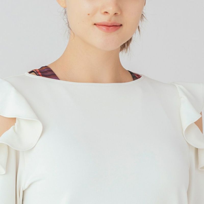 肩のフリルが魅力たっぷりの長袖プルオーバー。肩を肌見せすることでヘルシーな印象に。軽量のさらりとした接触冷感素材で快適に過ごせます。ヨガウェアの上にさっと着てレッスンの行き帰りにもおすすめです。