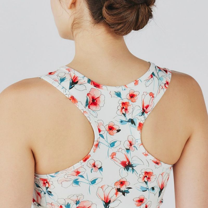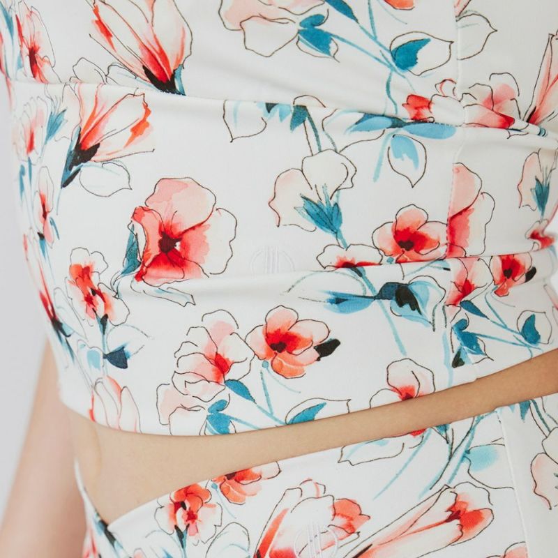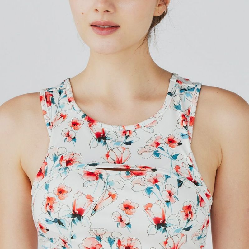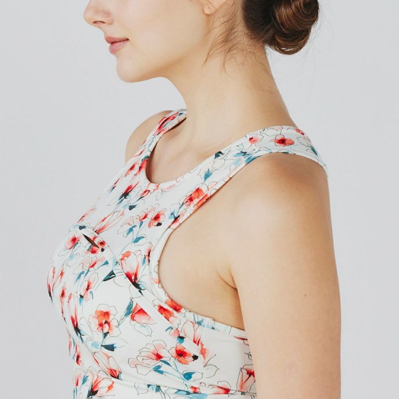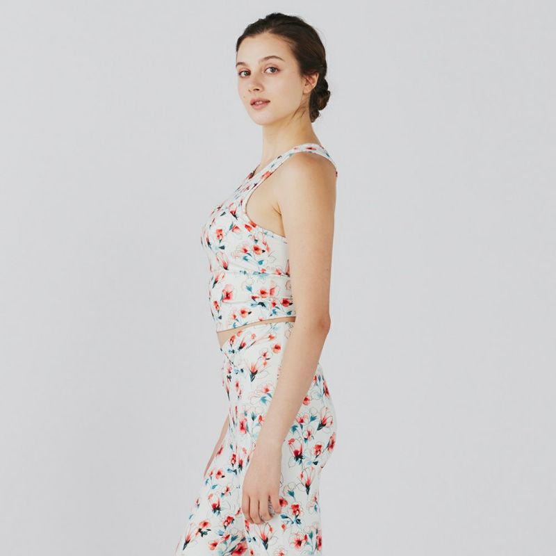 胸元の切り替えがアクセントになったリジーオリジナルのプリントブラトップ。長めの丈感で露出を控えつつお腹周りをカバーしてくれます。柔らかく伸びのよいストレッチ素材でなめらかな着心地です。アイボリーのベースに赤く愛らしい花が散りばめられたフラワープリント。