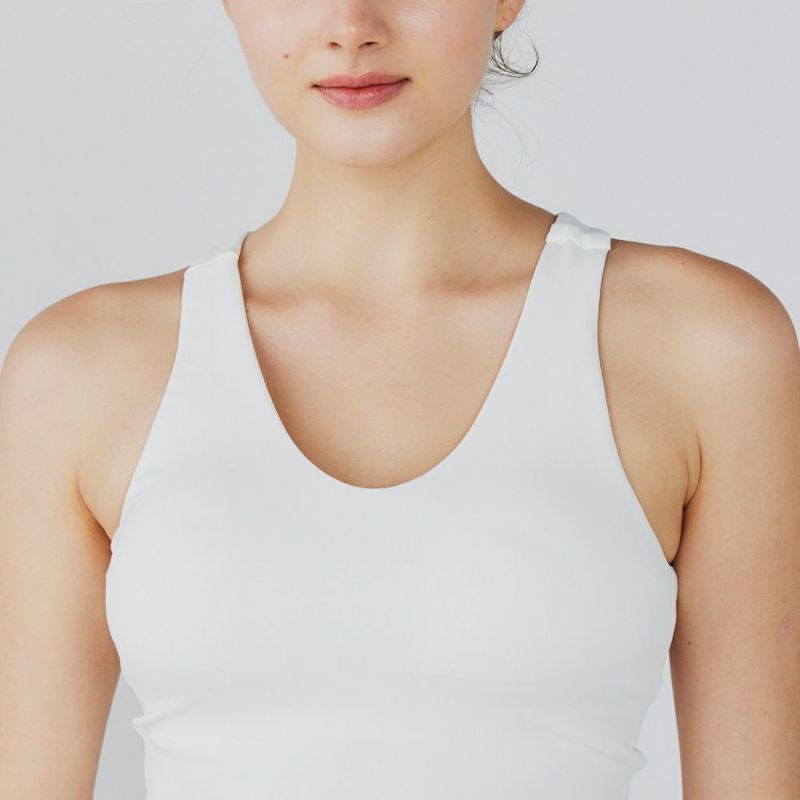 なめらかでソフトな肌触りの生地を使用したブラトップ。柔らかく膨らみのあるパウダータッチの質感で、接触冷感、吸汗速乾、透け防止機能ありの機能性素材です。少し長めの丈感でお腹周りをカバーしてくれます。