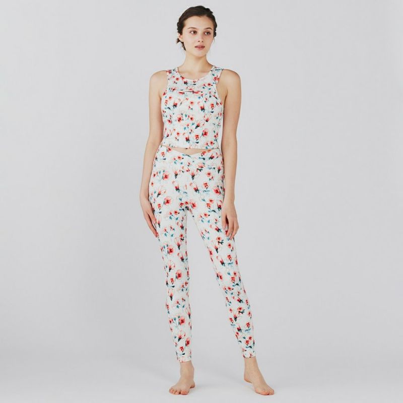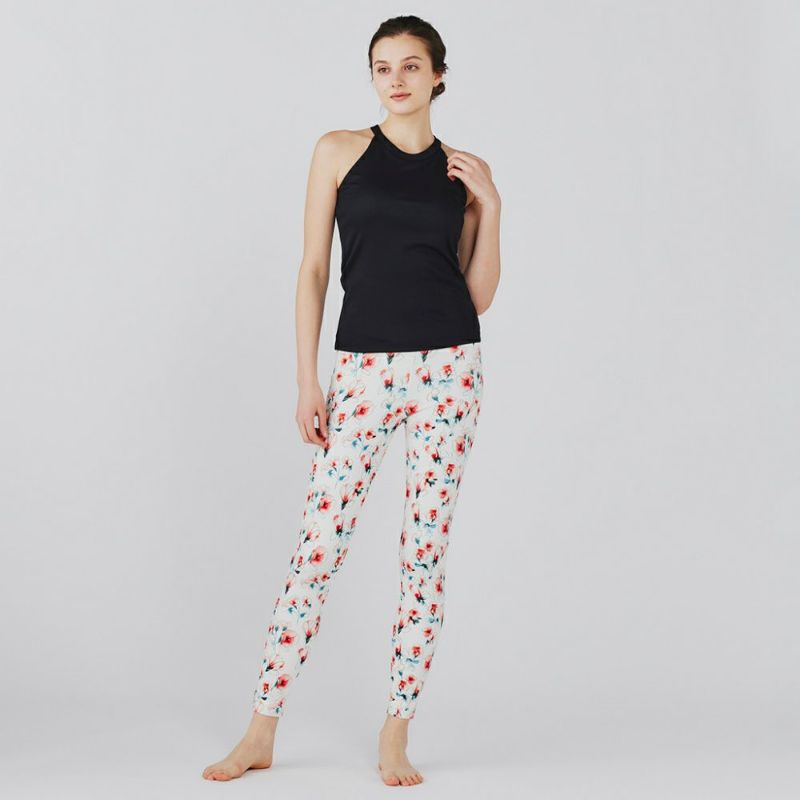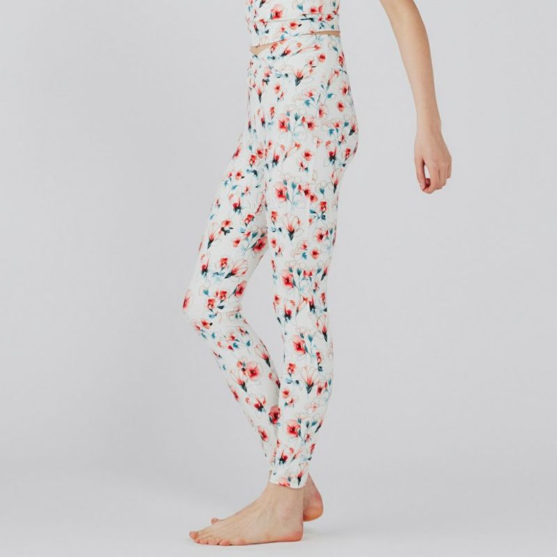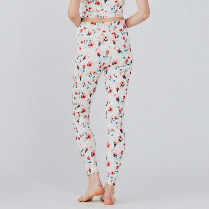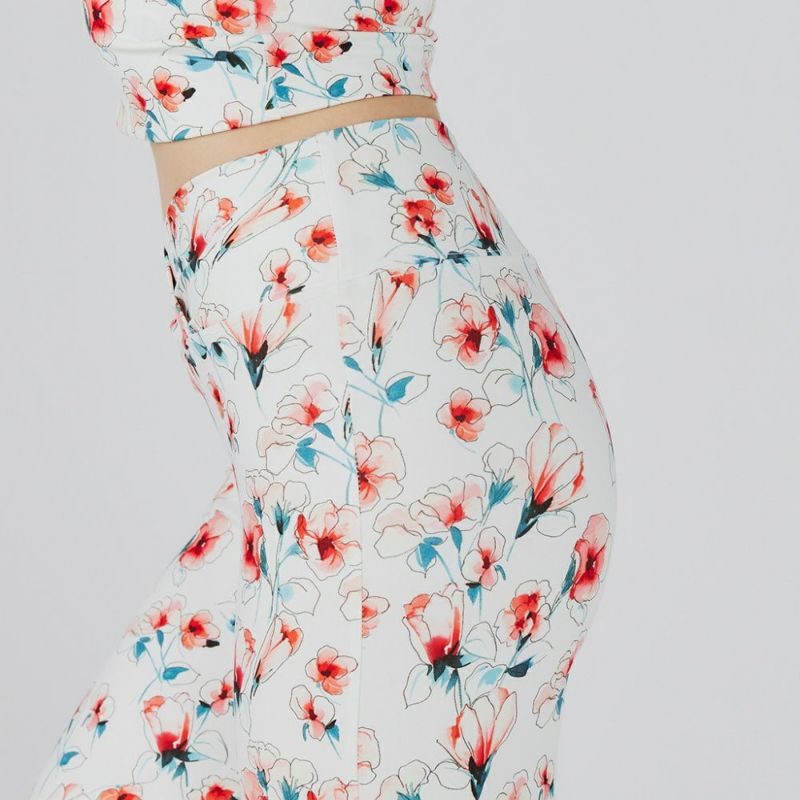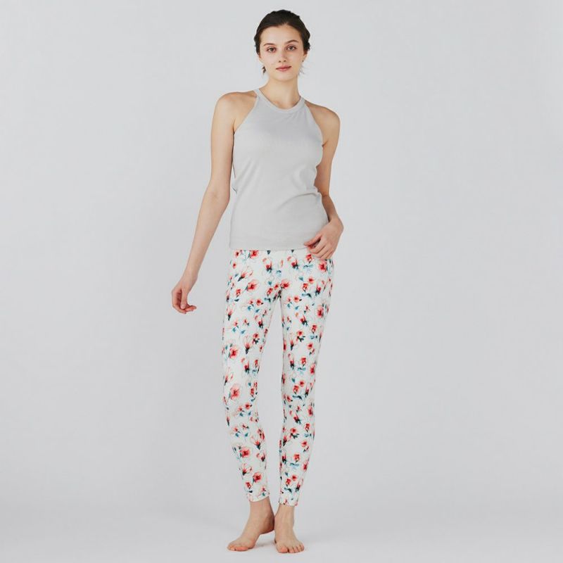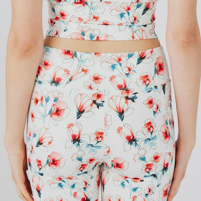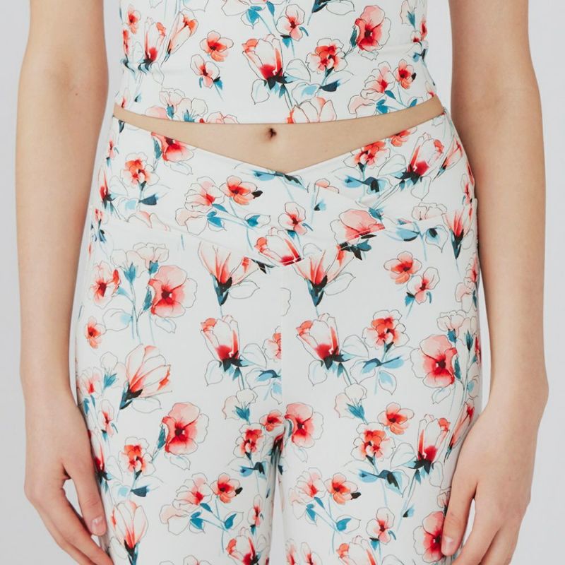 クロスデザインがウエストを美しく見せてくれるリジーオリジナルのプリントレギンス。柔らかく伸びのよいストレッチ素材でなめらかな着心地です。アイボリーのベースに赤く愛らしい花が散りばめられたフラワープリント。
