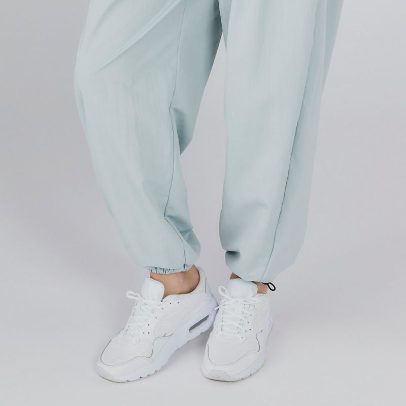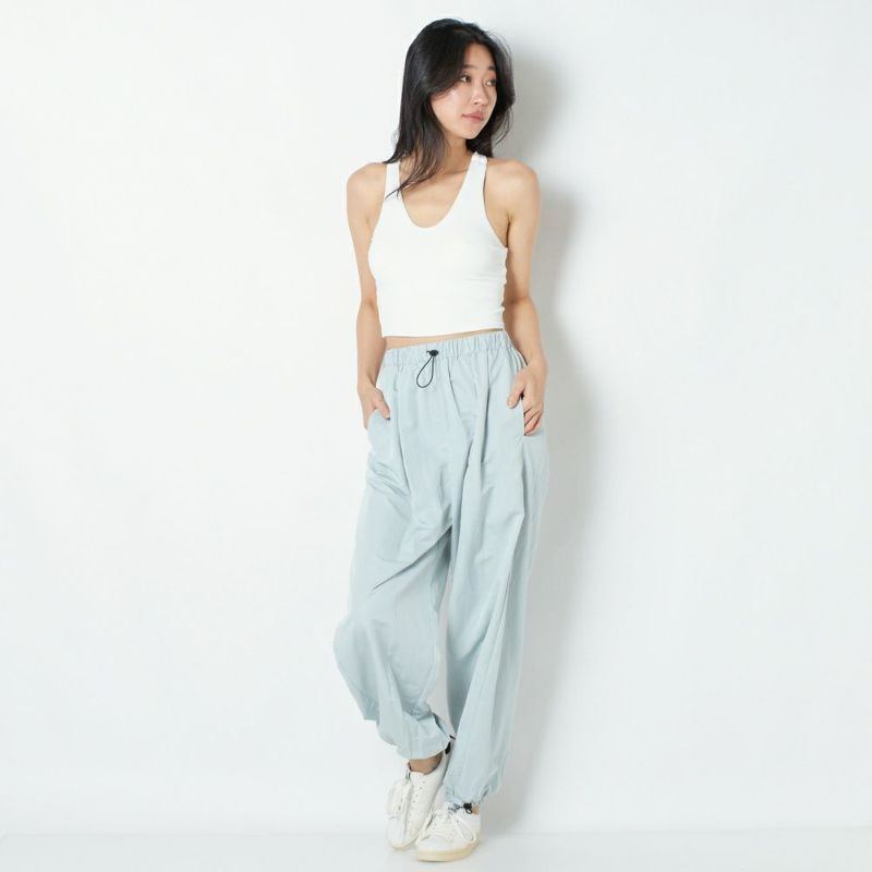光沢感のあるタフタ生地をたっぷりと使用したパラシュートパンツ。ゆったりとした分量のあるシルエットで、トップスにタンクトップなどすっきりとしたアイテムを合わせればスタイルアップ効果抜群です。薄手の素材で涼しく、夏場でも着用できます。ヨガの行き帰りにレギンスの上からも履くことができます。