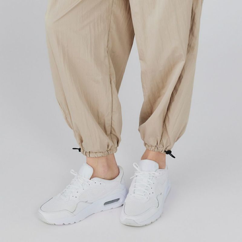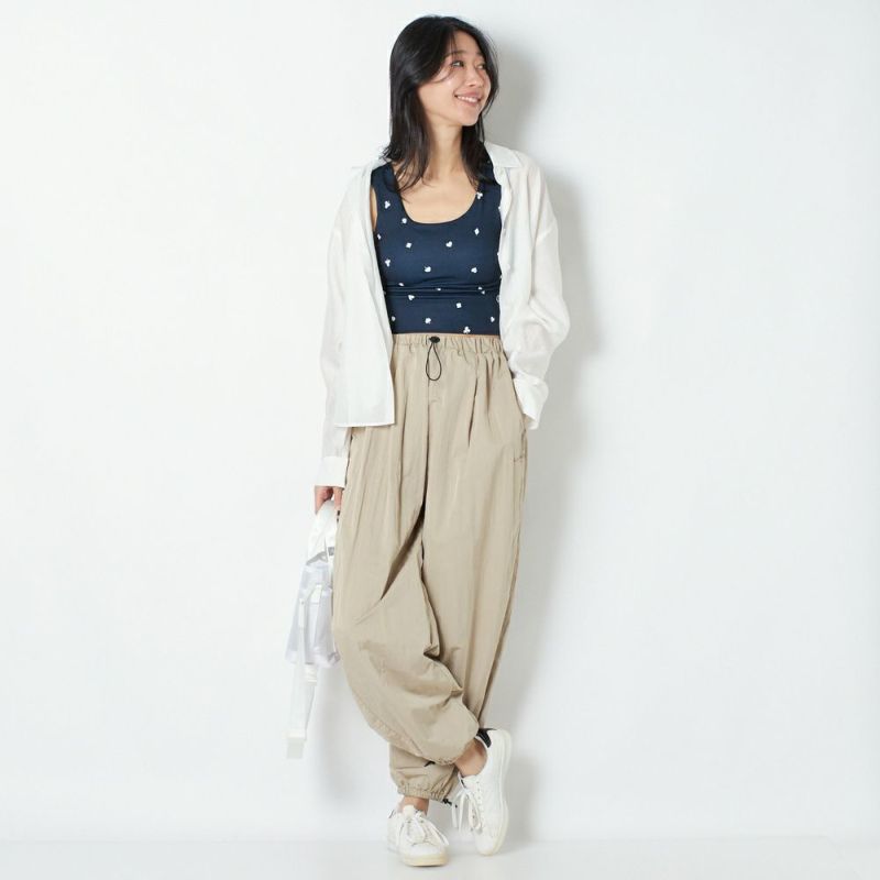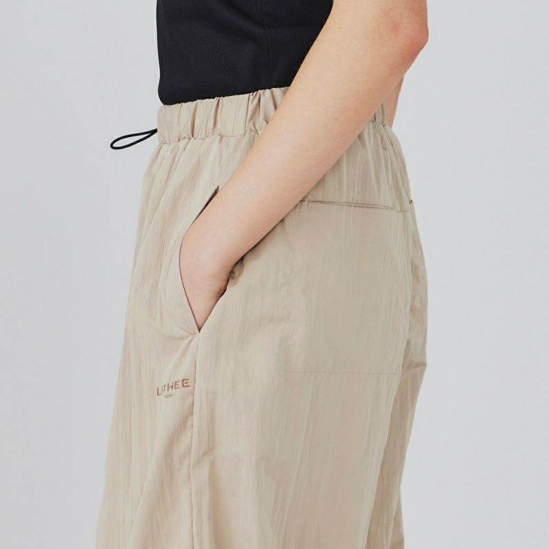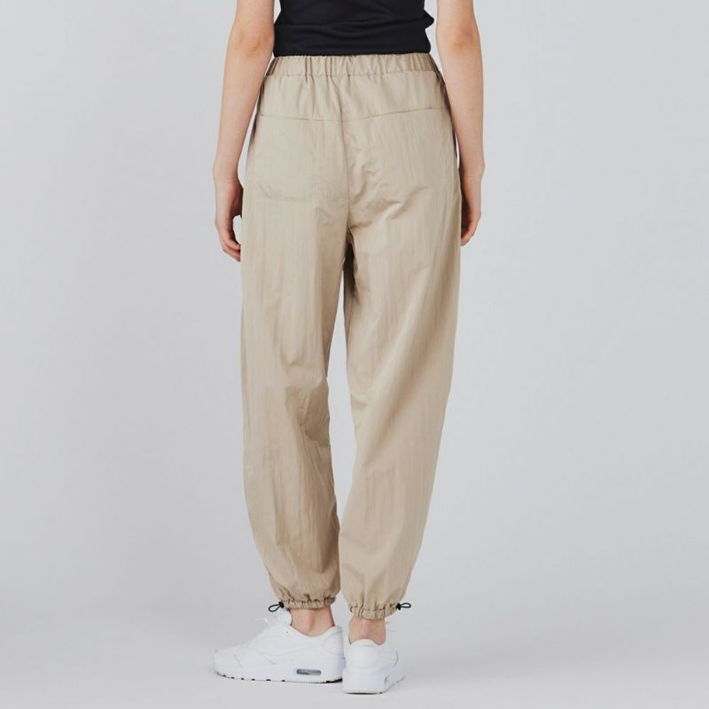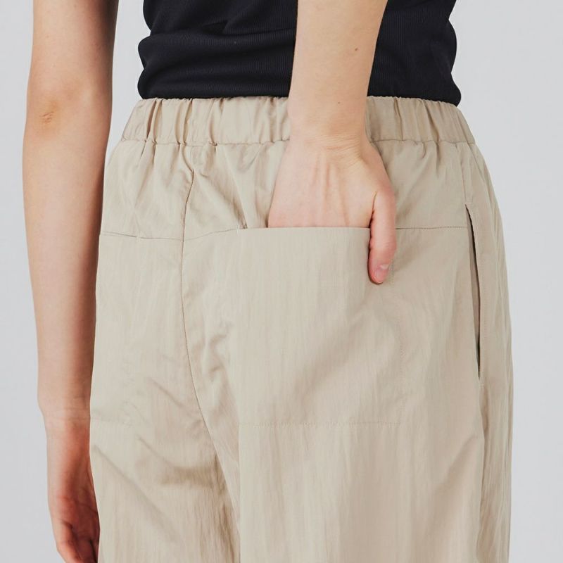光沢感のあるタフタ生地をたっぷりと使用したパラシュートパンツ。ゆったりとした分量のあるシルエットで、トップスにタンクトップなどすっきりとしたアイテムを合わせればスタイルアップ効果抜群です。薄手の素材で涼しく、夏場でも着用できます。ヨガの行き帰りにレギンスの上からも履くことができます。