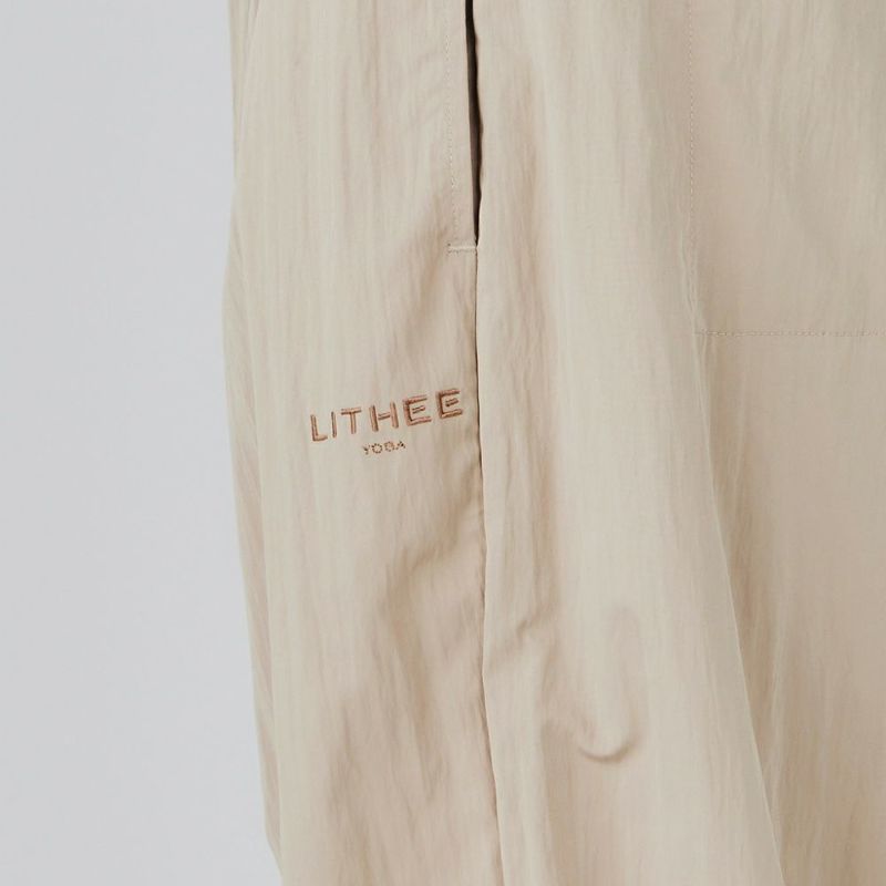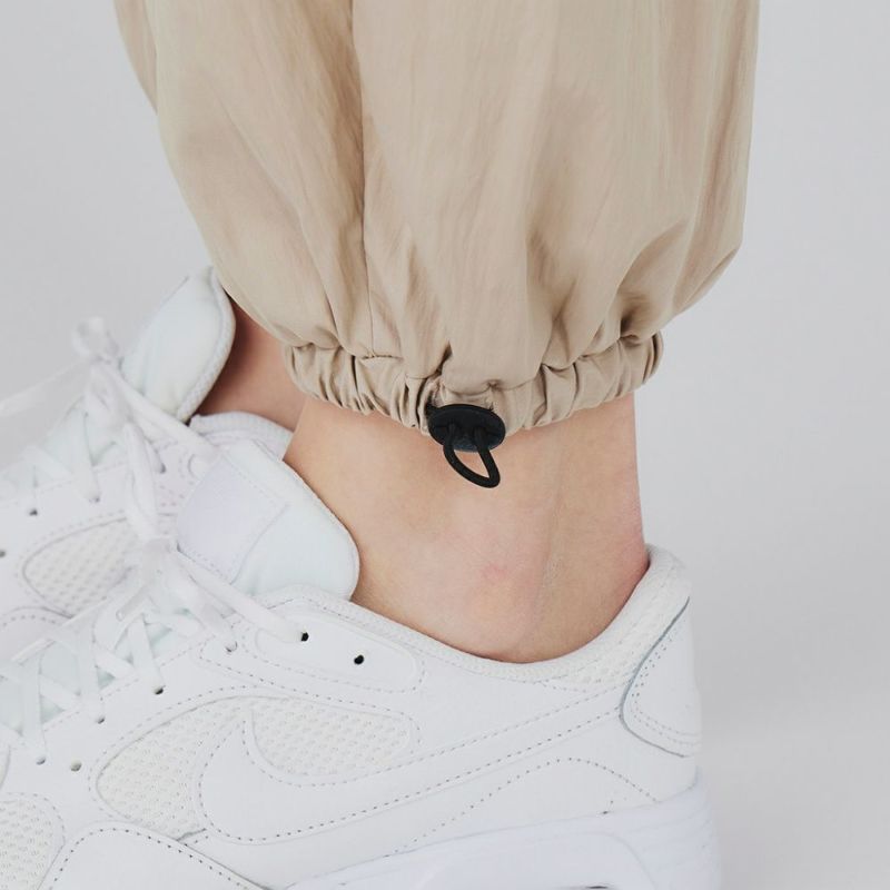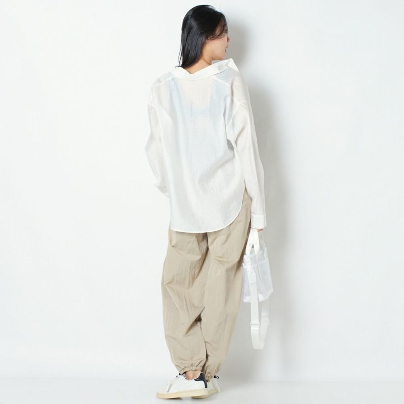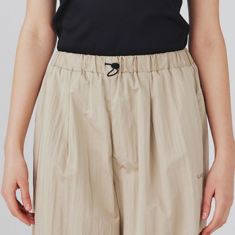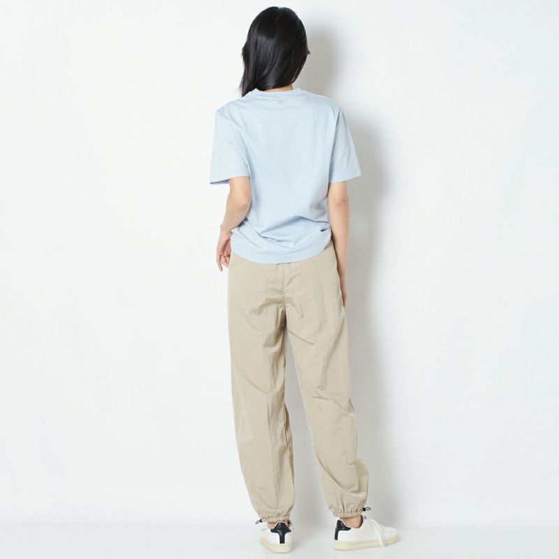 光沢感のあるタフタ生地をたっぷりと使用したパラシュートパンツ。ゆったりとした分量のあるシルエットで、トップスにタンクトップなどすっきりとしたアイテムを合わせればスタイルアップ効果抜群です。薄手の素材で涼しく、夏場でも着用できます。ヨガの行き帰りにレギンスの上からも履くことができます。