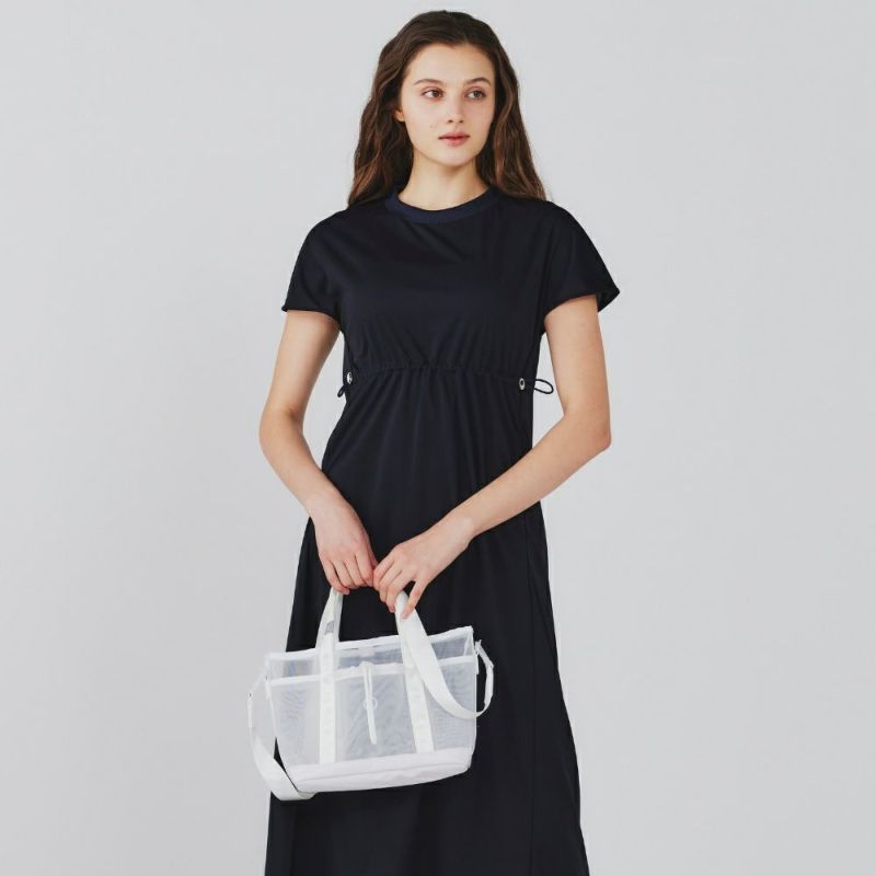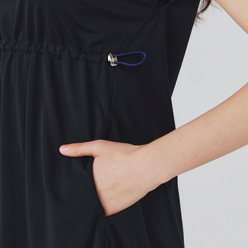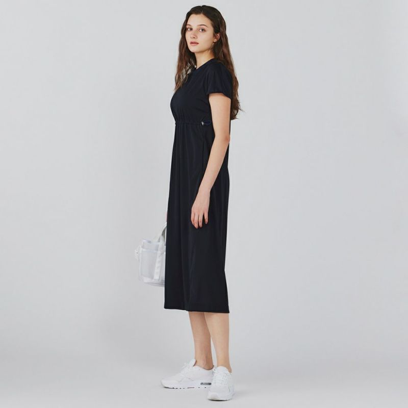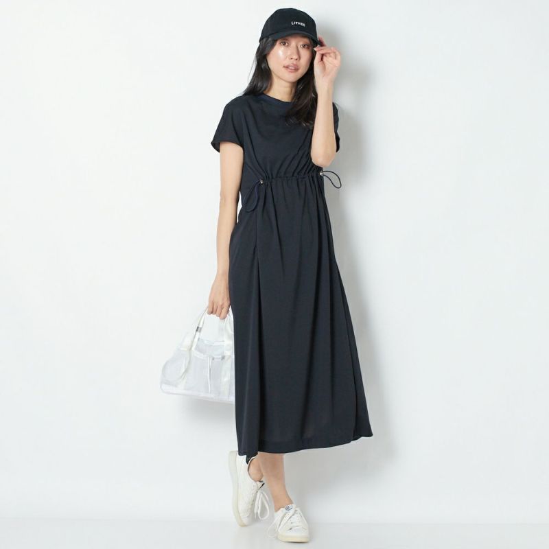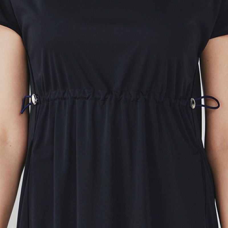 薄手のジャージー素材を使用したカットソーワンピース。ウエストのコードを絞ってギャザーを寄せることでスタイルよく見せてくれます。ストレッチが効いており、接触冷感の機能素材で、強撚糸を使用したドライタッチな風合いが夏場にも涼しい快適な着心地。速乾性がありシワになりにくいイージーケア素材です。ポケットにはメッシュを使用しています。