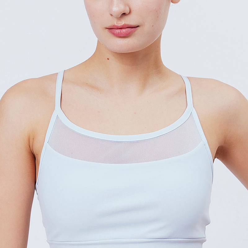 メリルライトハイテンション素材を使用したブラトップ。フロントのチュール切替が涼し気で、バックスタイルはエレガントな印象のストラップデザイン。マイクロファイバーならではの柔らかさ、快適な肌触りと着心地のよいストレッチ性が魅力。接触冷感機能がありひんやりと心地よく、ドライタッチな涼しい着用感です。