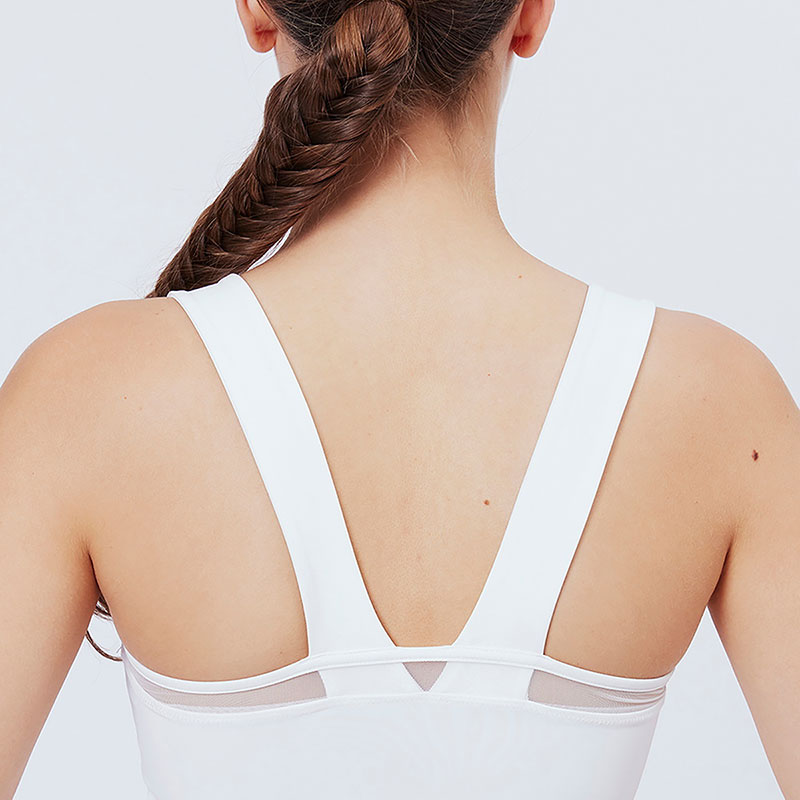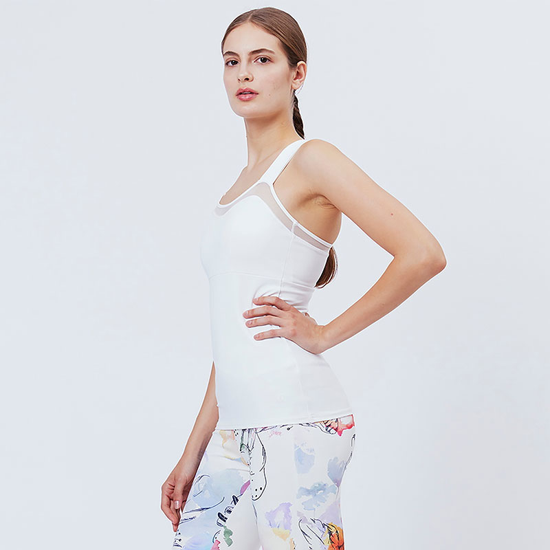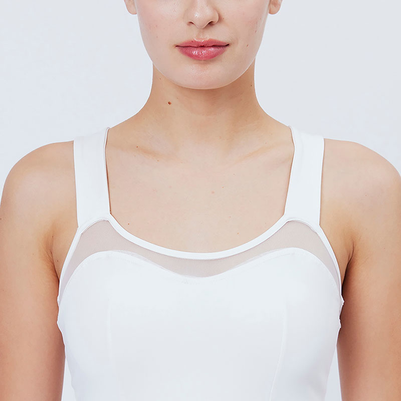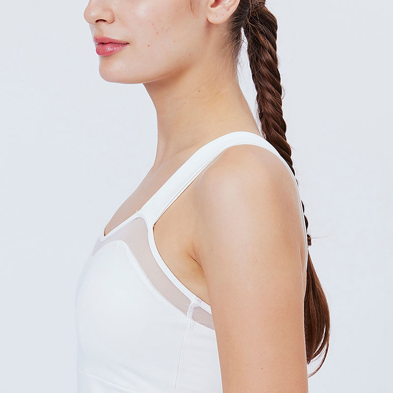 胸元をチュール素材で切り替えたブラキャミソール。ストレッチの効いたなめらかなベアスムース素材で涼しく、吸汗速乾機能ありの快適な着心地です。