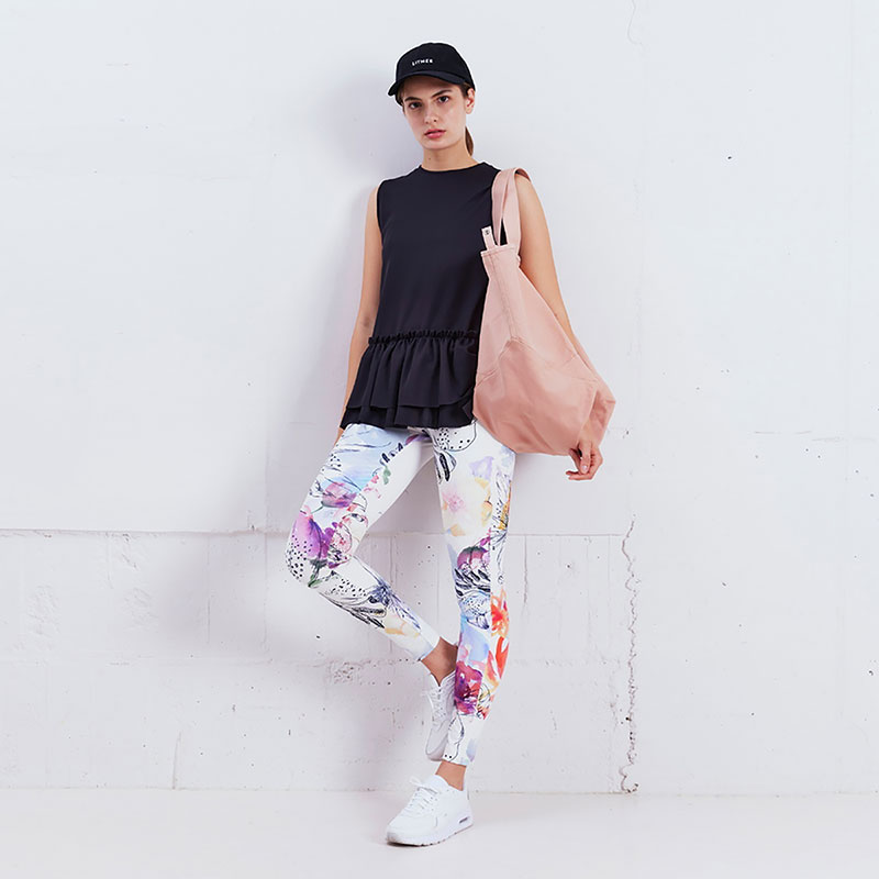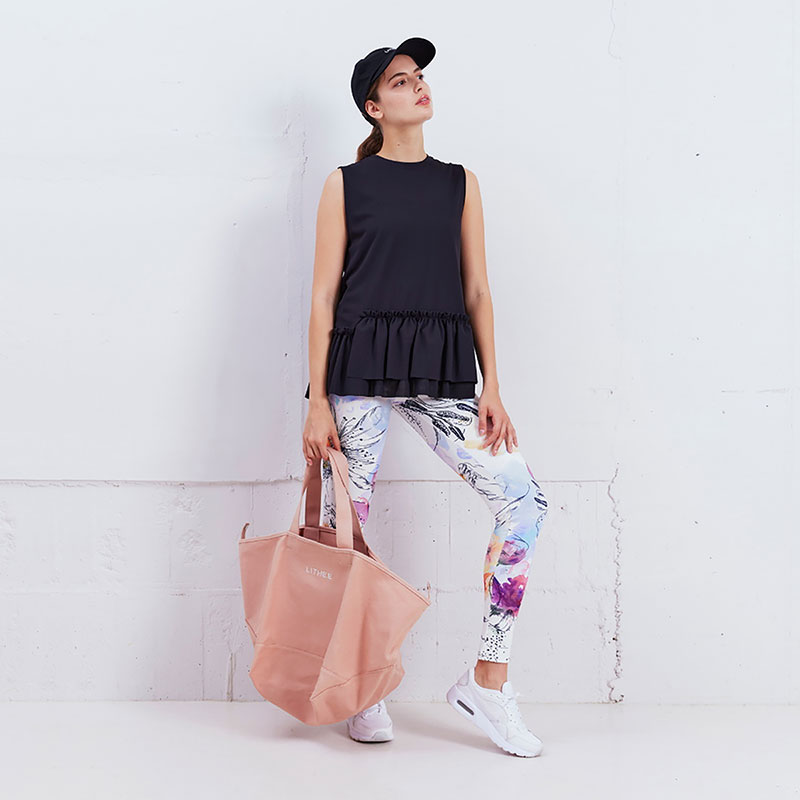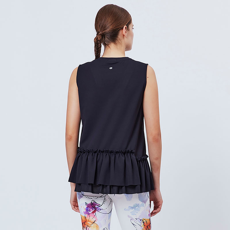 裾にフリルをあしらったメッシュ素材のノースリーブトップス。ボリューム感のあるフリルがかわいいデザインです。高機能素材COOLMAXを使用し、涼しく快適でドライな着心地。シワになりにくくお手入れのしやすいイージーケアが魅力です。ヨガウェアの上にさっと着て行き帰りにもおすすめです。