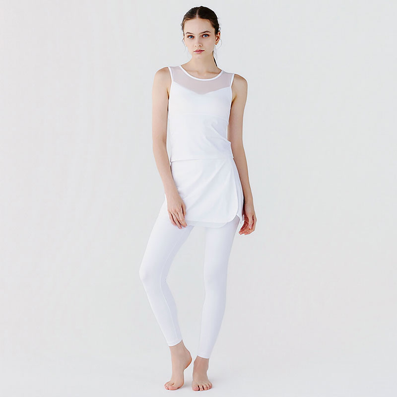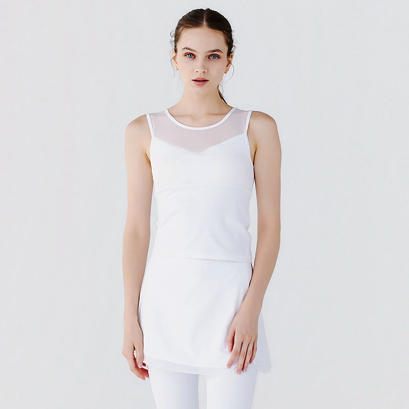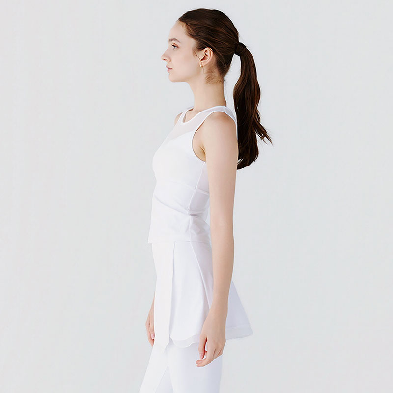 バストから上にチュールを重ねたデザインタンクトップ。ベーシックなシルエットにチュールの透け感を加えることで、シンプルながらエレガントに見せてくれるデザインです。露出を控えつつ、胸元の透け感が女性らしい印象にしてくれます。デザインはDOUBLE STANDARD CLOTHINGが監修しています。