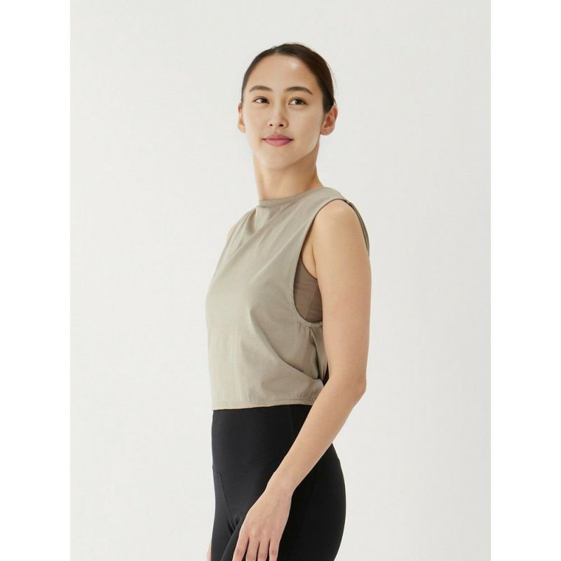 タンクトップデザインのレイヤードとブラトップのセットアイテム。クリアな表面感で肌離れの良い、適度にナチュラルさがある素材をタンクトップに使用しました。ナイロン混で比較的乾きやすい素材です。背中のデザインは結ぶこともでき、2WAYで使用が可能。ブラトップはタンクトップ形のデザインなので、肩紐がずれるという心配もありません。