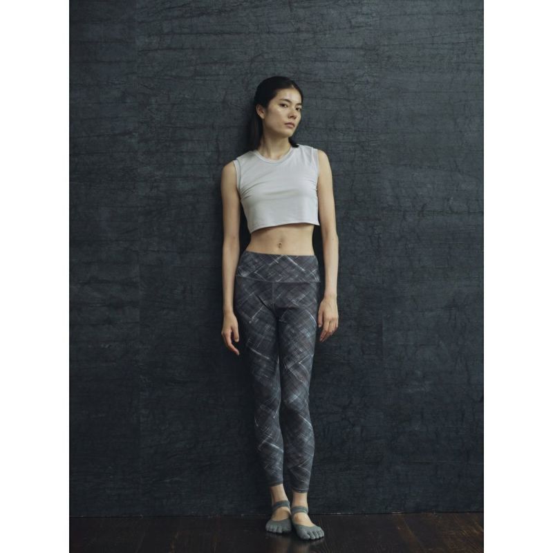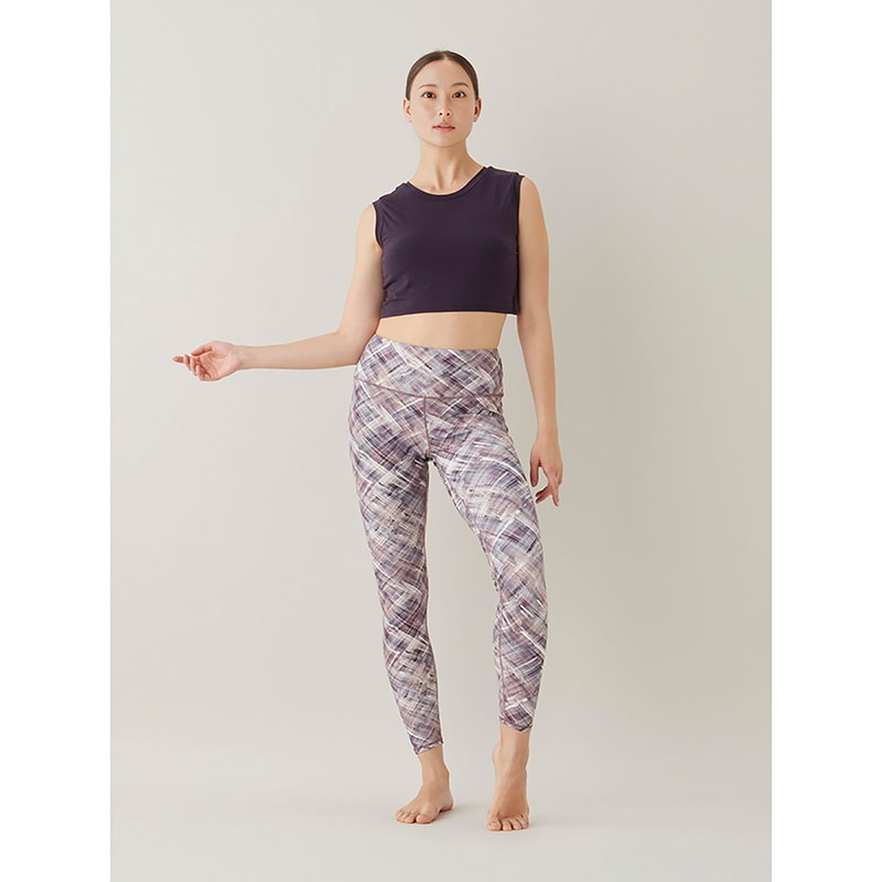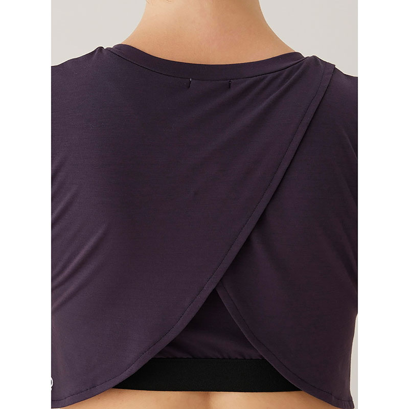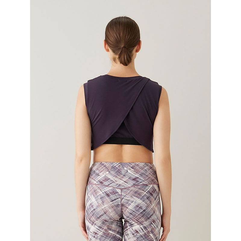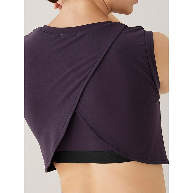ヘルシーなショート丈トップス。広めの肩幅で脇肉もしっかりカバーする、カップ付きトップです。後ろのクロスしているディティールがデザインポイント。配色のゴムもポイントになっています。