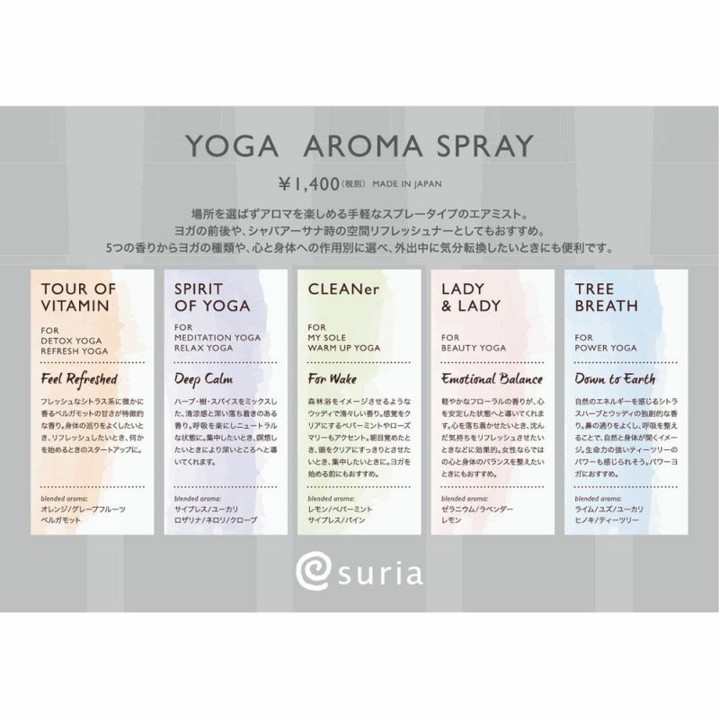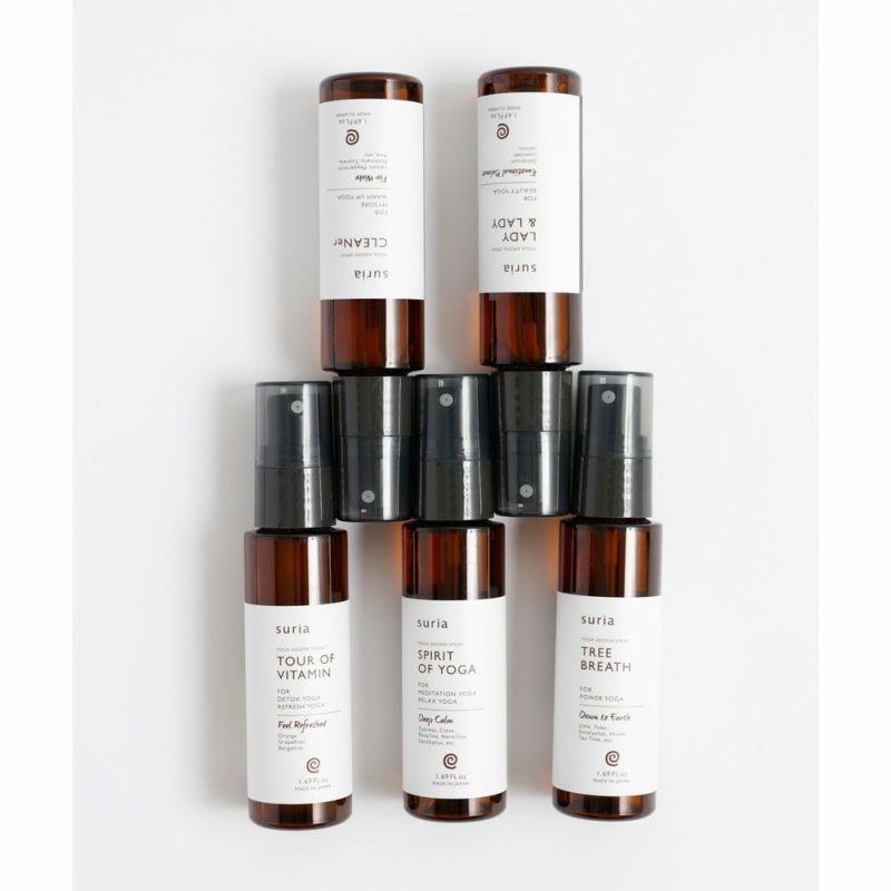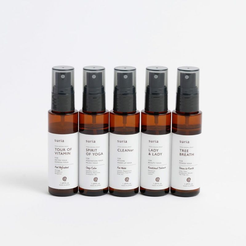 身体の周囲や空間に向けてスプレーするだけで場所を選ばずにアロマを楽しめる、スプレータイプのエアミスト。バッグの中に入れて持ち歩きがしやすいので、外出中の気分転換にぴったりなアイテムです。ヨガの種類やその日の気分で香りを変えて楽しめる、豊富なバリエーションも魅力です。ヨガの前後の空間リフレッシュにもおすすめです。