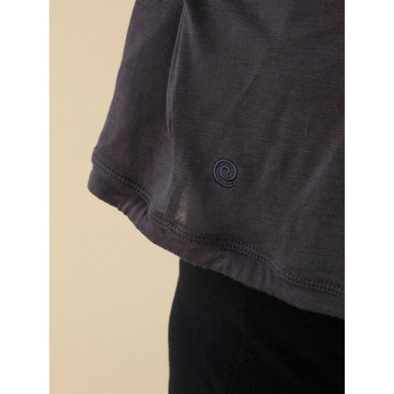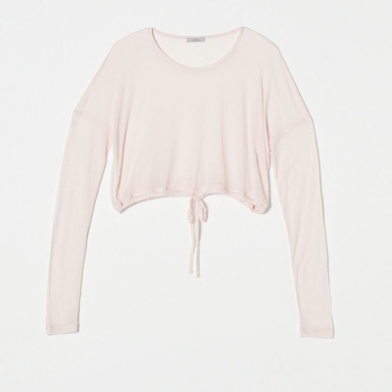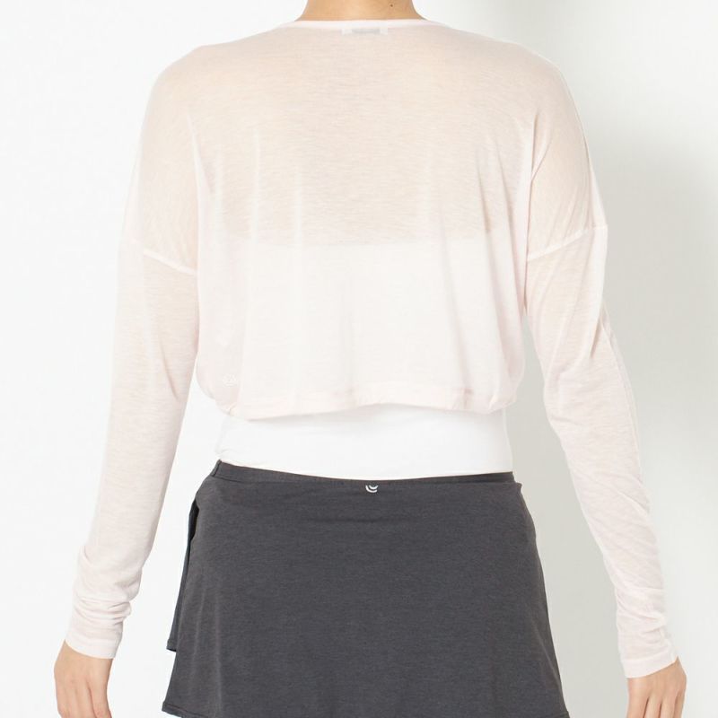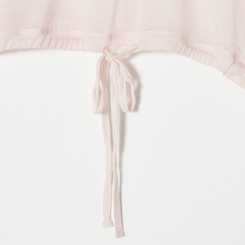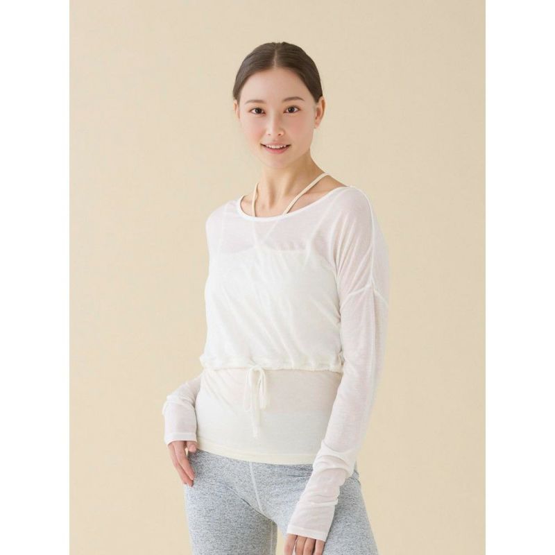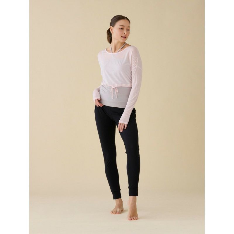 裾にゴムが入っているので調節が簡単な短丈のトップス。ゴムを締めればズレる心配が有りません。薄手でサラサラとした生地で着心地が軽く、蒸れる心配が少ないのでヨガにピッタリです。シルエットにはゆとりがあるので動きやすくなっています。インナーとの重ね着もしやすいアイテムです。