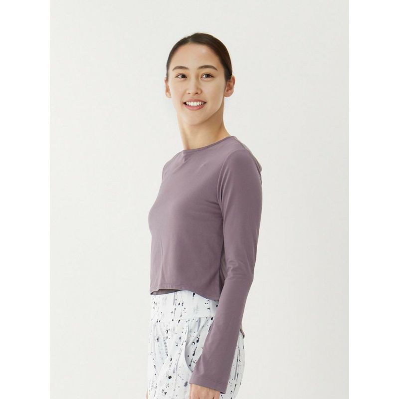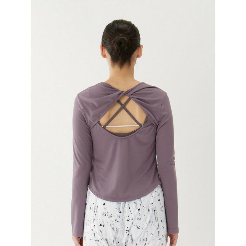 ヨガをする時に機能的に優れた素材でありながらも、艶のある風合いが美しいのが特徴の素材を使用しています。背中のデザインからインナートップスを覗かせたり、背中をすっきりと見せたりと、着こなしで周りと差別化ができるトップスです。程よく身体に沿ったサイズ感ながらも、袖口は若干広がっていて女性らしいシルエットとなっております。