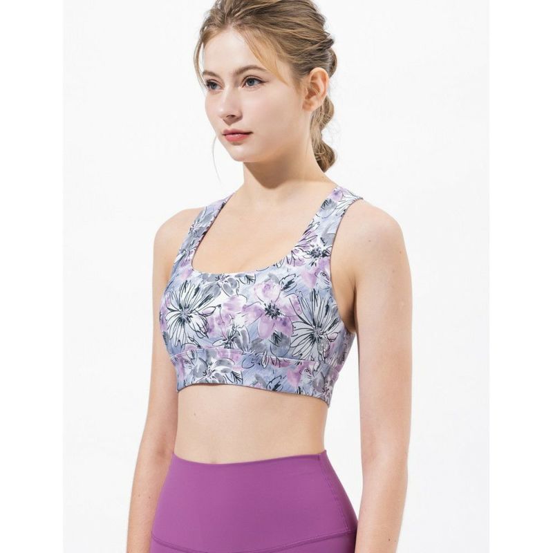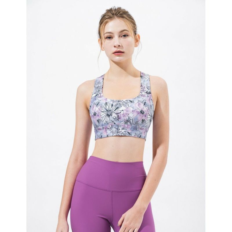 フラワー柄がかわいいブラトップ。肩甲骨すっきり見えのバッククロスデザインです。太めのストラップで安定感があります。ブラなのに露出感が気にならず、動きやすいので着心地抜群。胸元に映える華やかなオリジナルプリント柄がイージーヨガならではのデザインです。