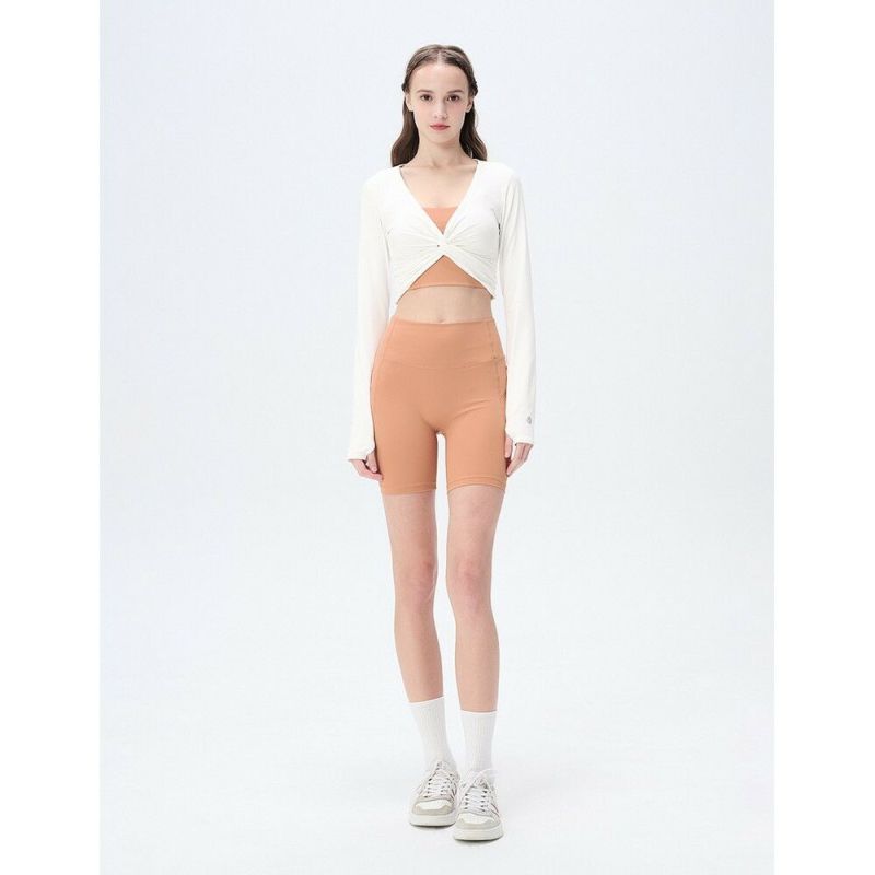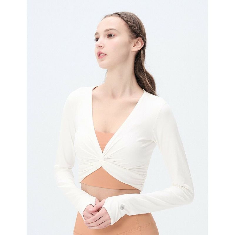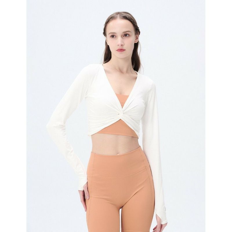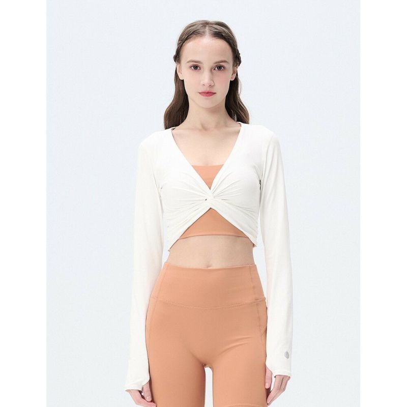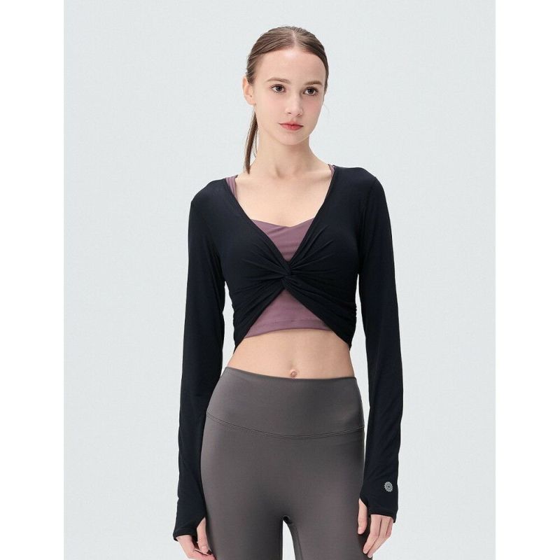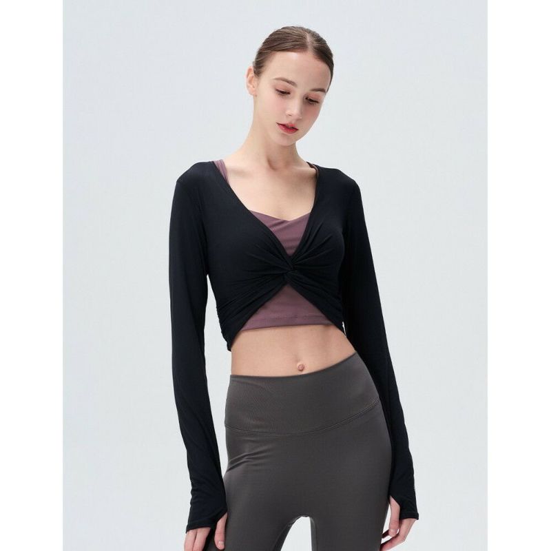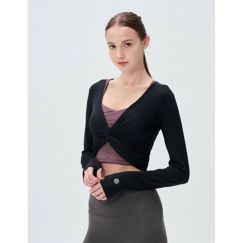 エレガントな印象を与える、ツイストデザインが特徴のロングスリーブトップス。フロント部分で布をねじった立体的なデザインが、ウエストラインを美しく強調します。