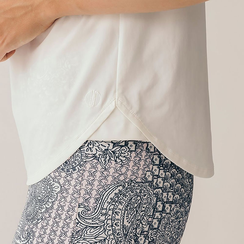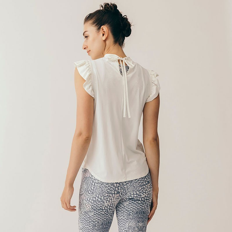 肩のフリルがフェミニンなデザイントップス。後ろはリボンで結べるハイネック仕様。薄くて軽いなめらかな速乾素材を使用し、汗をかいても快適に過ごせます。ヨガだけでなくレッスンの行き帰りにも着用でき、コンパクトに持ち運べるためトラベルウェア、ビーチシーンにもおすすめです。デザインはDOUBLE STANDARD CLOTHINGが監修しています。