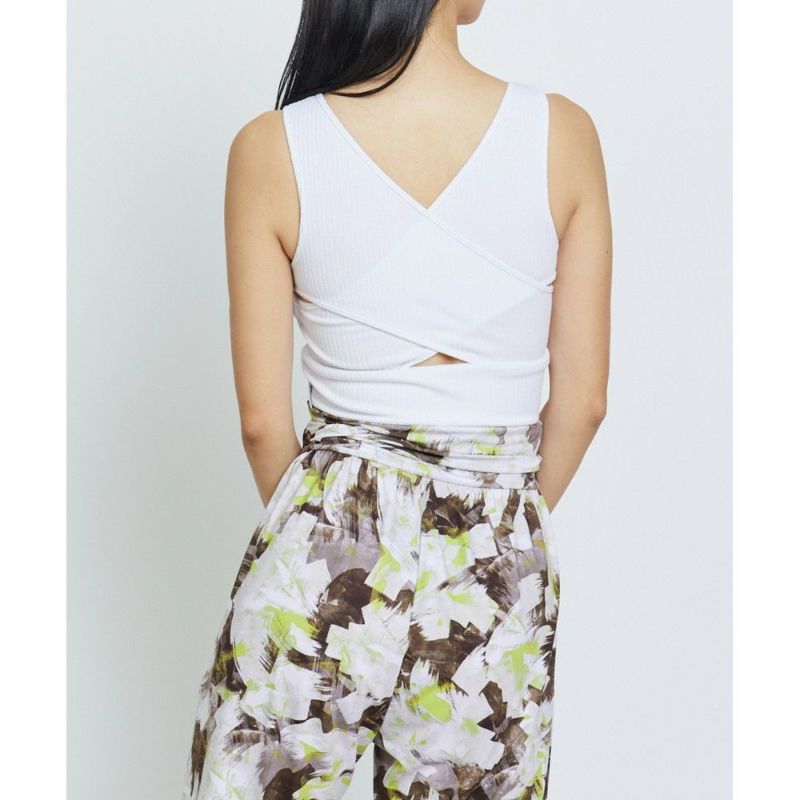 ジュリエ人気のリブ素材。バッククロスのショートトップスはヘルシーな肌見せができるアイテムです。ヨガインストラクターにも人気のデザインです。スパンの効いたリブ素材はよりアクティブなシーンにも対応できます。