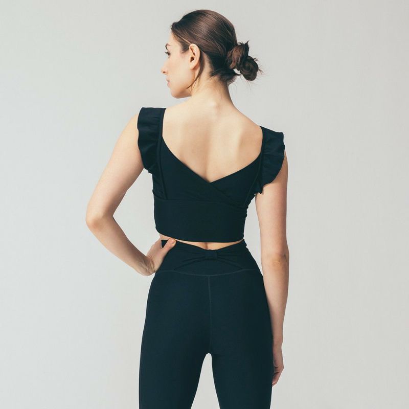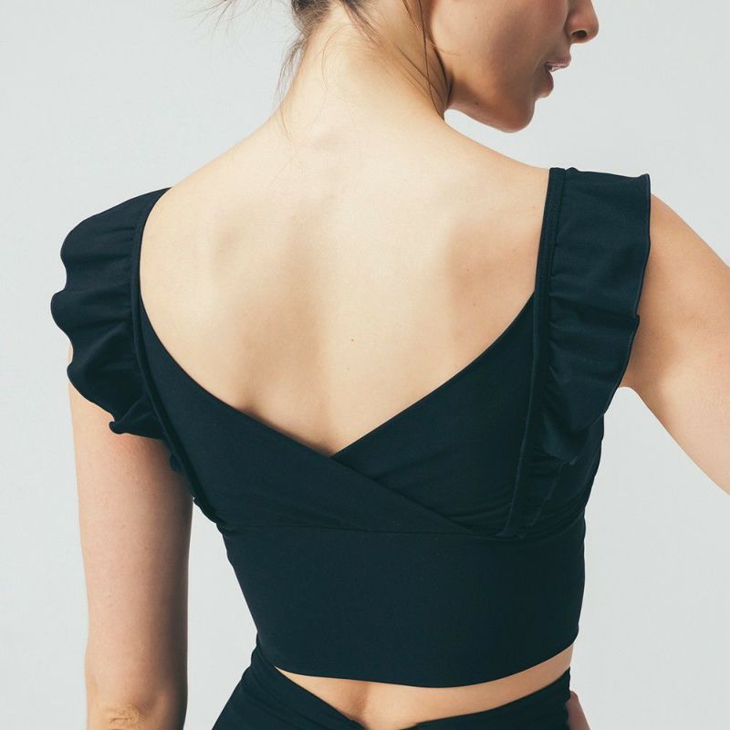 肩がフリルになった甘めディテールのブラトップ。長めの丈感でお腹までカバーしてくれます。引き締めてくれるタイトな着用感です。高品質なメリルハイテンション素材で、さらりとした肌触り/UVカット機能/接触冷感機能/ストレッチ機能。アクティブな動きのサポートを実現してくれます。