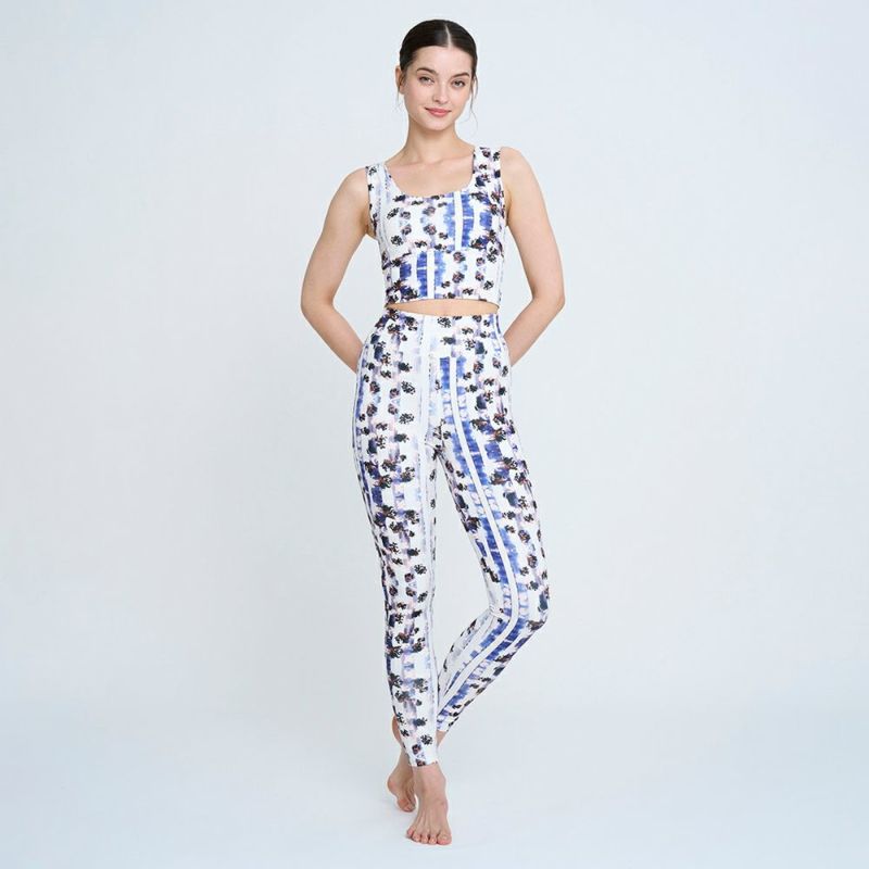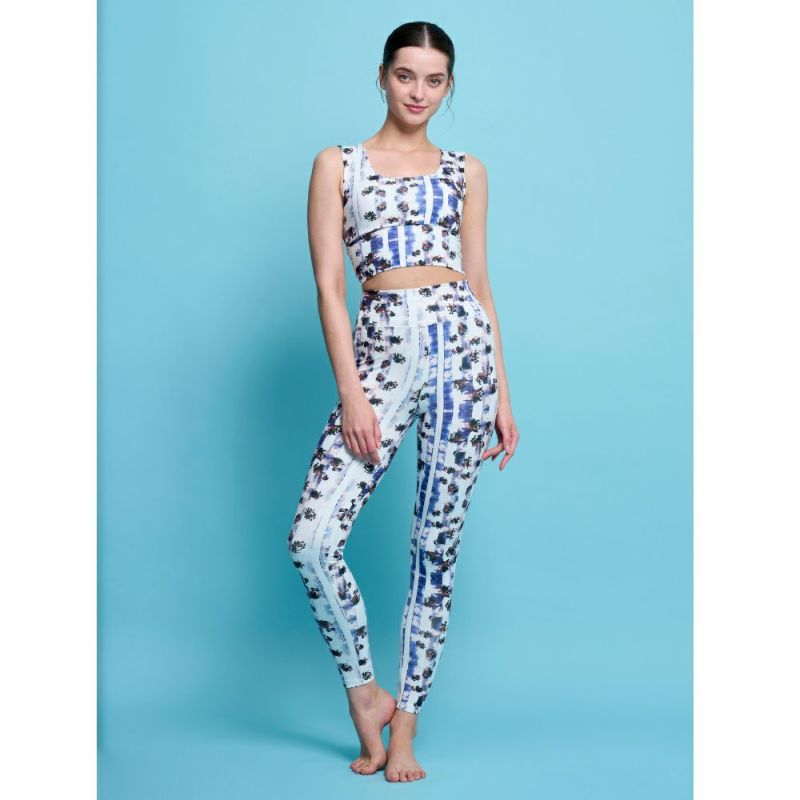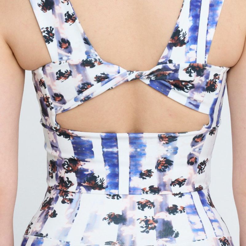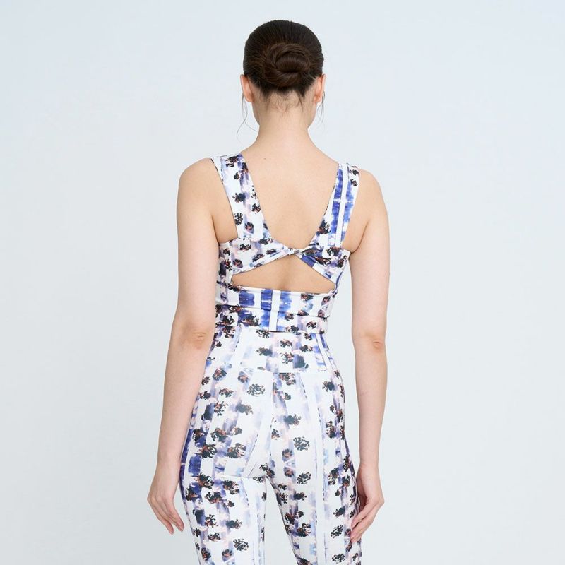 リジーオリジナルのプリントブラトップ。バックスタイルが可愛いねじりデザイン。柔らかく伸びのよいストレッチ素材でなめらかな着心地です。ブルーのストライプとダークブラウンの花柄がシックな印象の上品で落ち着いたプリント柄。