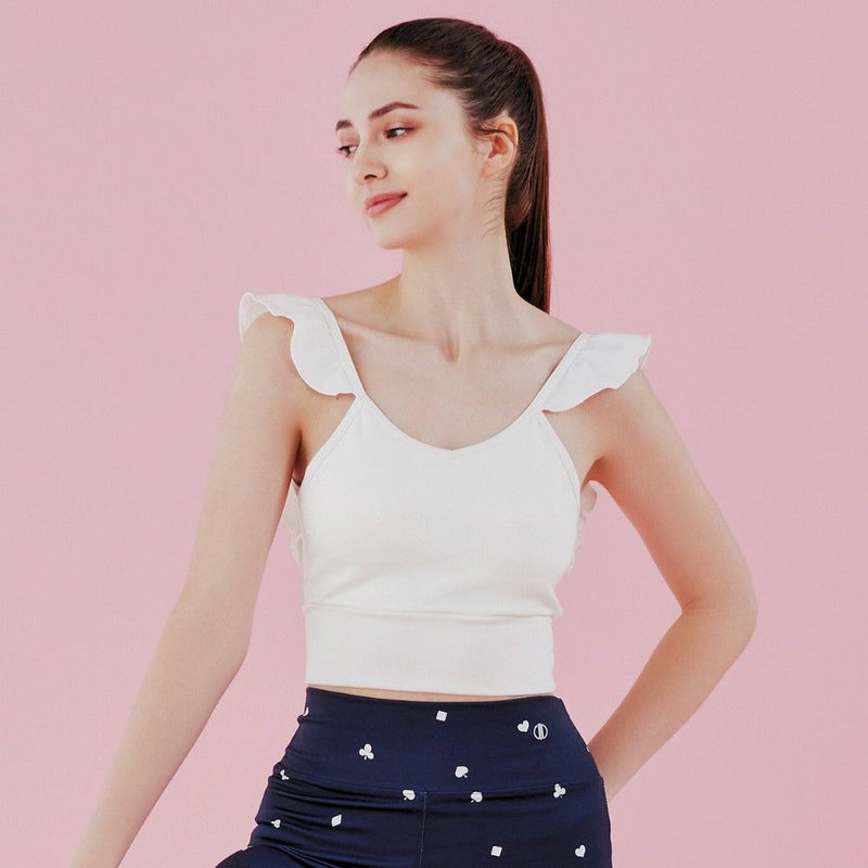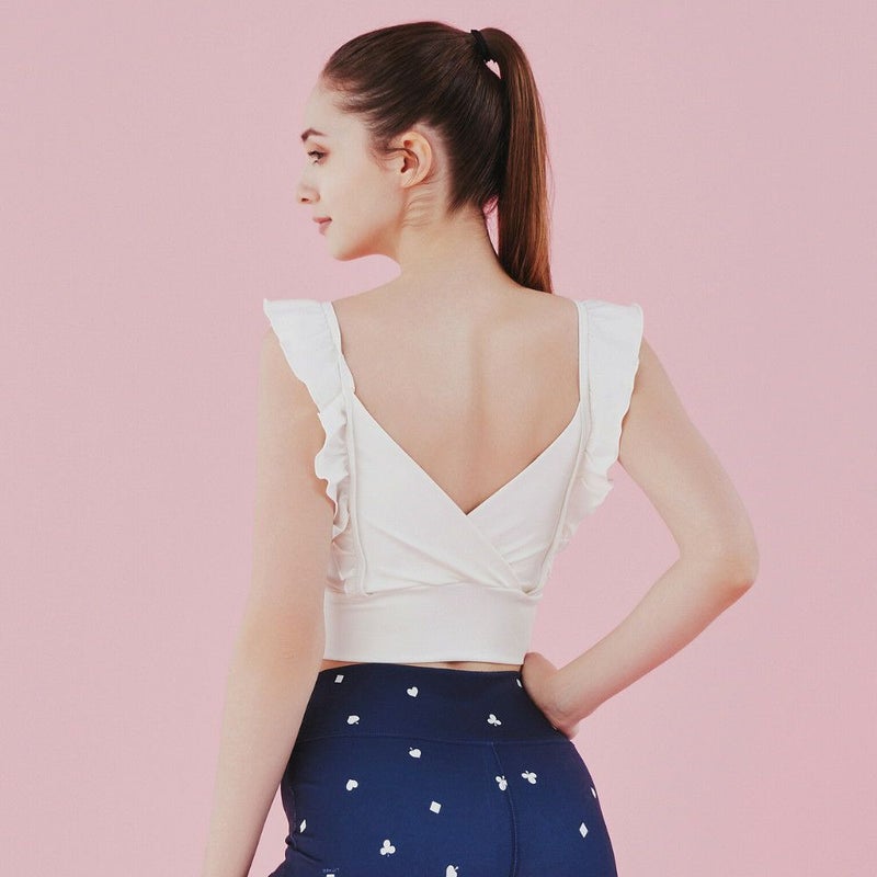肩がフリルになった甘めディテールのブラトップ。Vネックが顔周りをすっきりと見せてくれます。柔らかくソフトなストレッチ素材で締め付け感が少なくなめらかな着心地です。デザインはDOUBLE STANDARD CLOTHINGが監修しています。