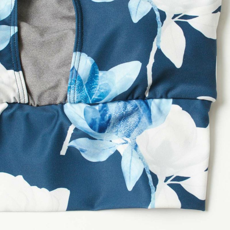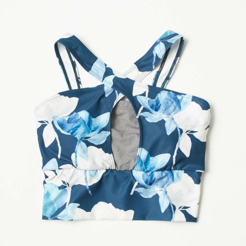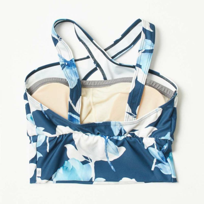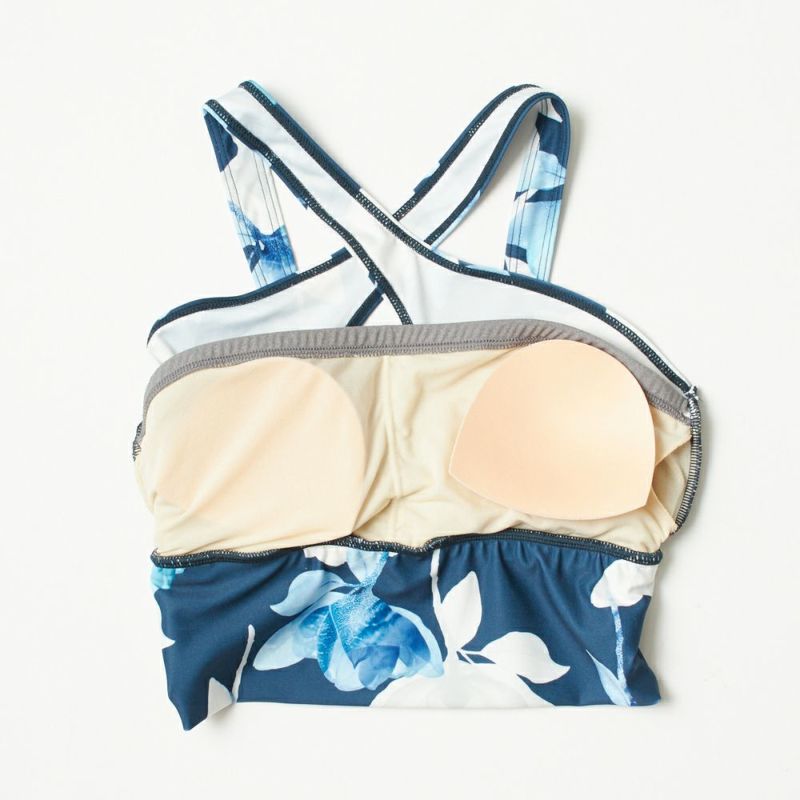 ストレッチ性の高いフラワープリントのクロストップスと無地のチューブトップを重ねた、デザイン性の高いトップス。吸水速乾性に優れたさらっとした肌触りの生地を使用した、快適な着心地の一枚です。ブラパッドは取り外し可能なので、清潔に使えます。同デザインのレギンスとのセットアップもおすすめです。