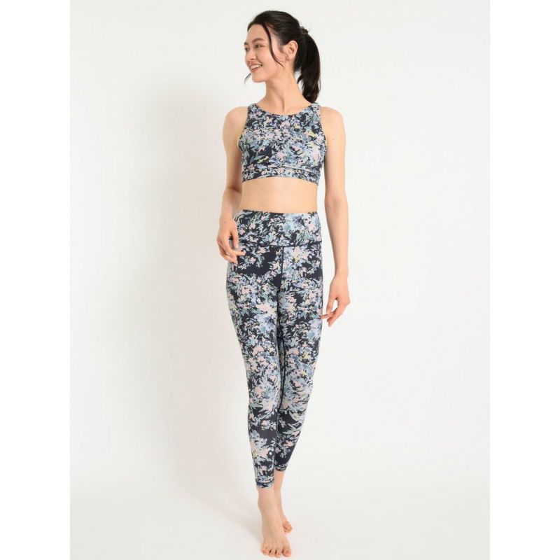 前は鎖骨周りをきれいに魅せるネックライン、後ろは細い紐がクロスされたデザインで華奢な印象のカップ付きブラトップ。オリジナルの手書き風フラワープリントでコーディネートに華やかさをプラスします。