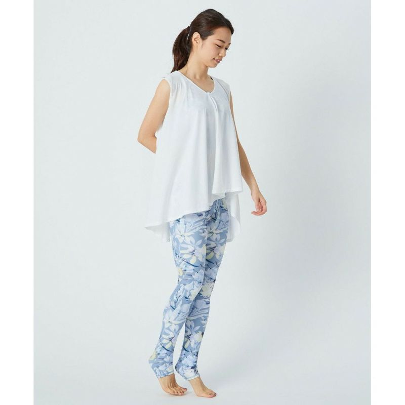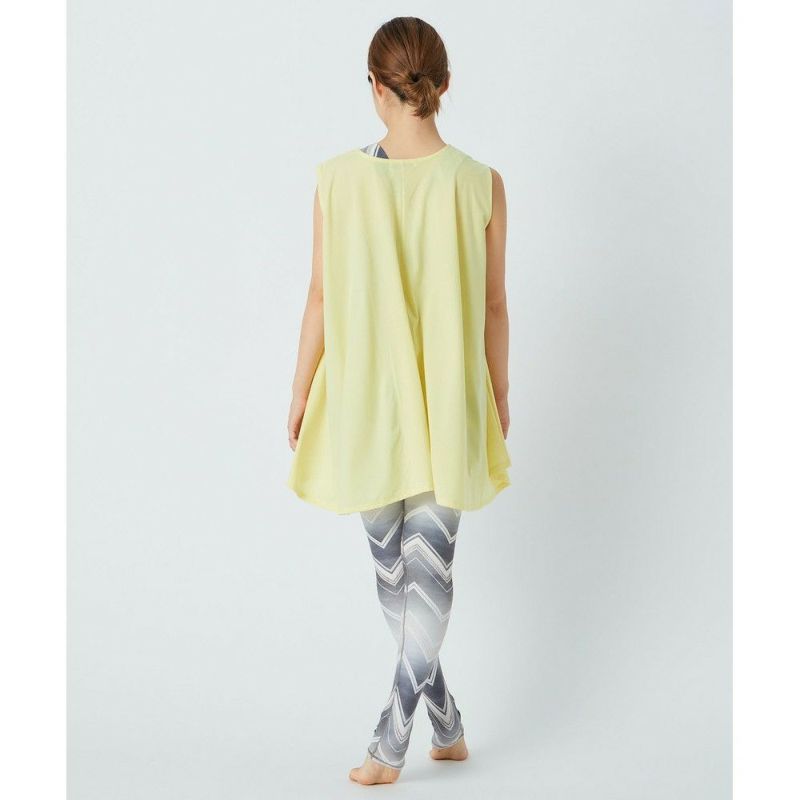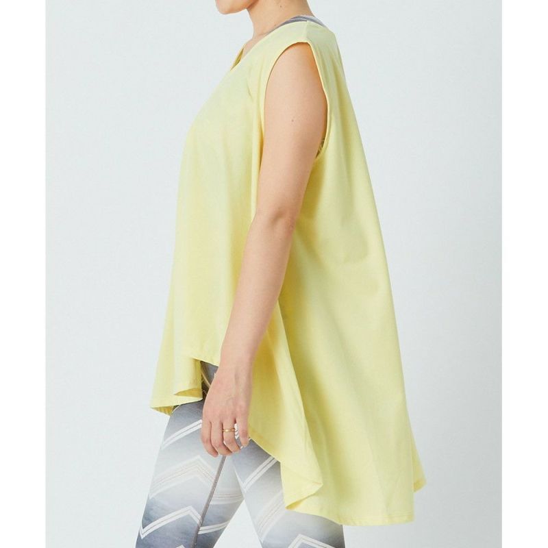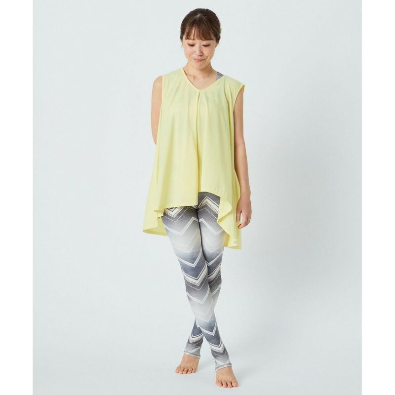 アシンメトリーなカッティングでサイドシルエットも美しく、バックはお尻が隠れる安心な丈感です。ダウンドックをしてもお尻で引っかかってめくれてきづらいです。動くたびにランダムに揺れる裾と、すっきりとしたVネックがデコルテを美しく見せてくれます。デイリーウェアとしても便利な1枚。