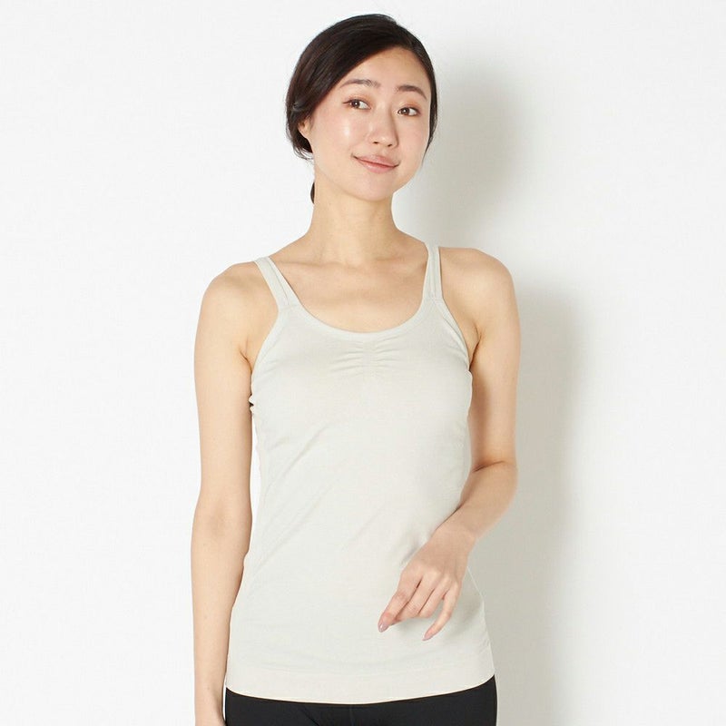 部分による編み分けで360度ストレッチを実現し、心地よく体をサポート。伸縮性・耐久性に優れ、太めのストレッチストラップでしっかりおさえてくれるので、安定感があり脇周りもすっきりと見せてくれます。しっかりとした厚さはハードな動きにも快適にフィットする新感覚インナーです。速乾性もあり、汗をかいてもさらりとした着心地です。耐久性があるのでイージーケアでOK。締め付けもなくストレスフリーな着心地で、背中を美しく見せるクロスストラップは着用時の安定感をプラス。バストを囲むギャザーとフロントのピンタックがバストラインを丸く美しく構築。ヨガの動きにも快適にフィットしてくれるので、多種多様なヨガにおススメです。