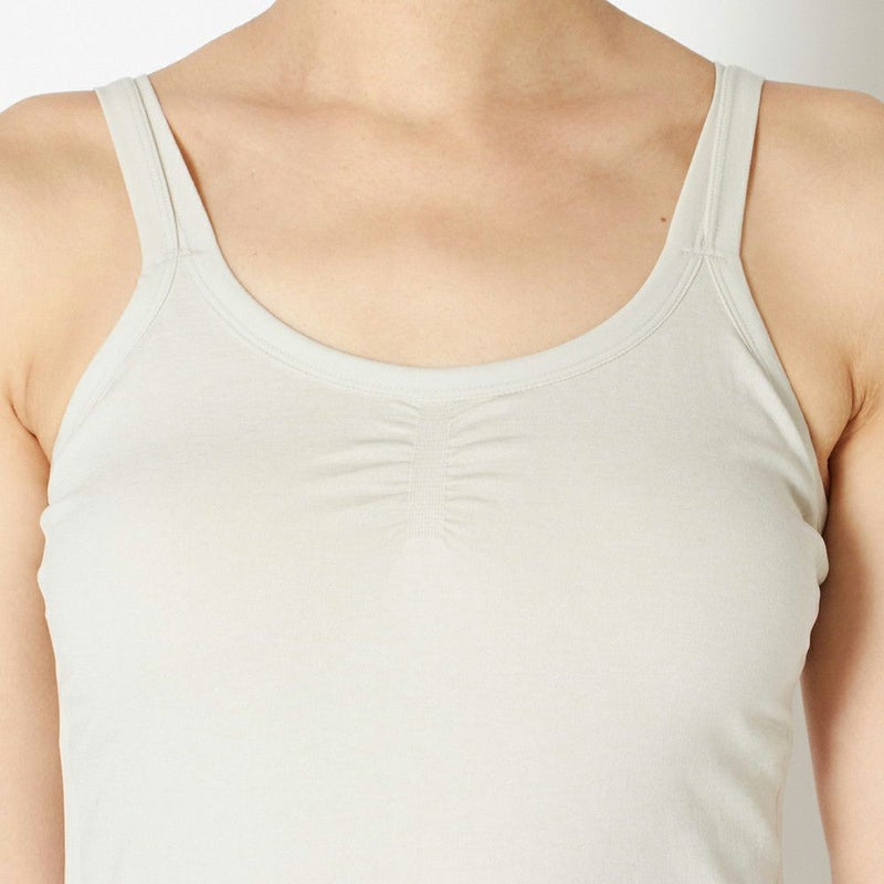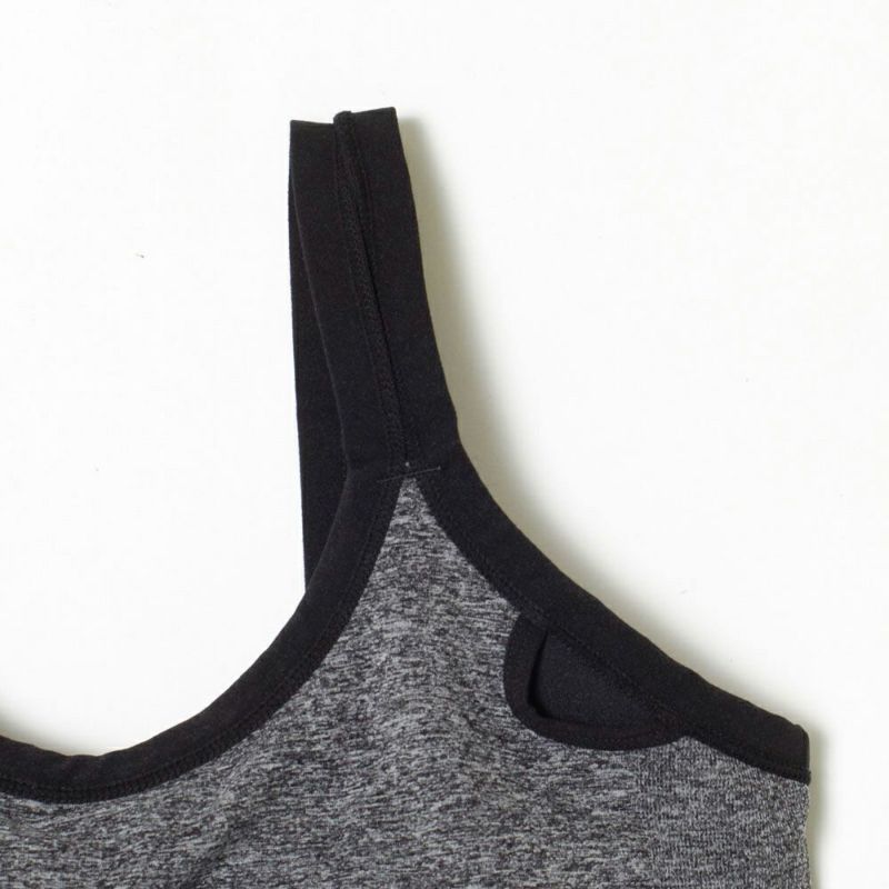 ダブルストラップ仕様で、動いたときにストラップ自体のずれを防止してくれる設計。空きすぎない胸元が1枚で着用してもインナーぽく見せない作りに。