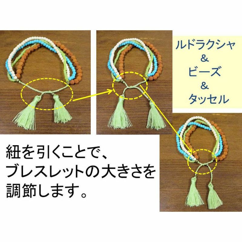 このブレスレットは、伸縮素材・ゴムは使用せず、タッセルを引っ張ることで、ブレスレットの輪の大きさを調節するタイプです。