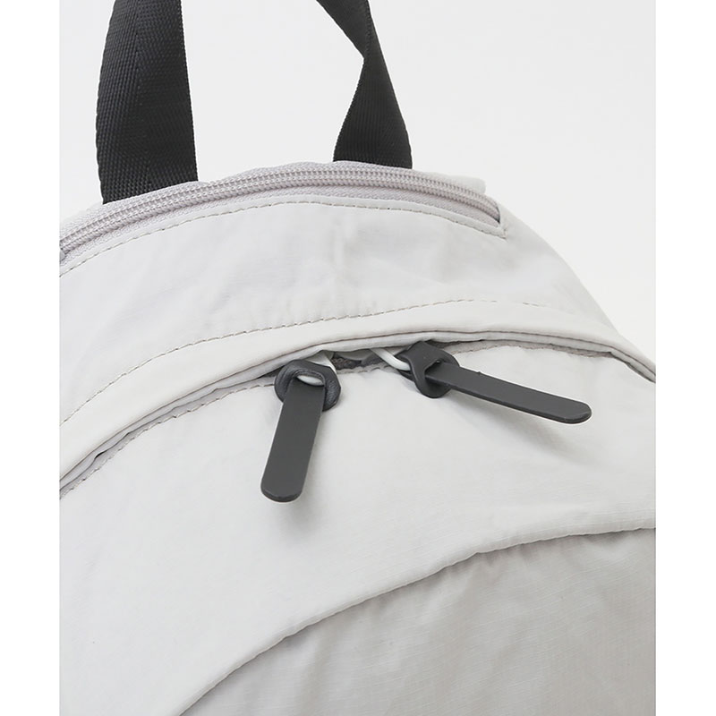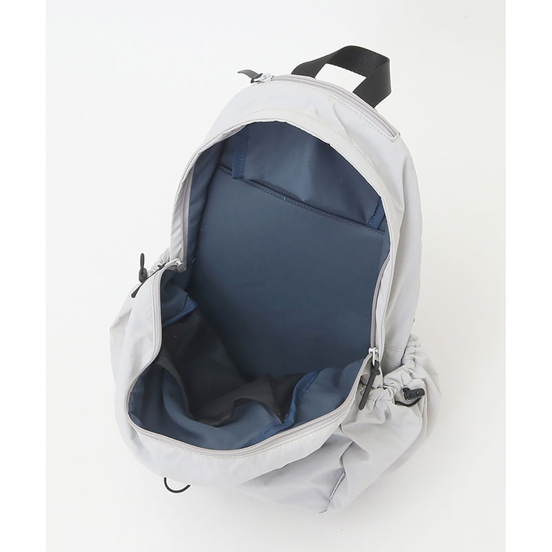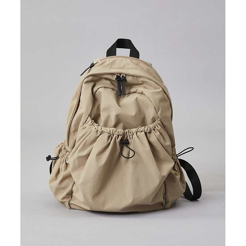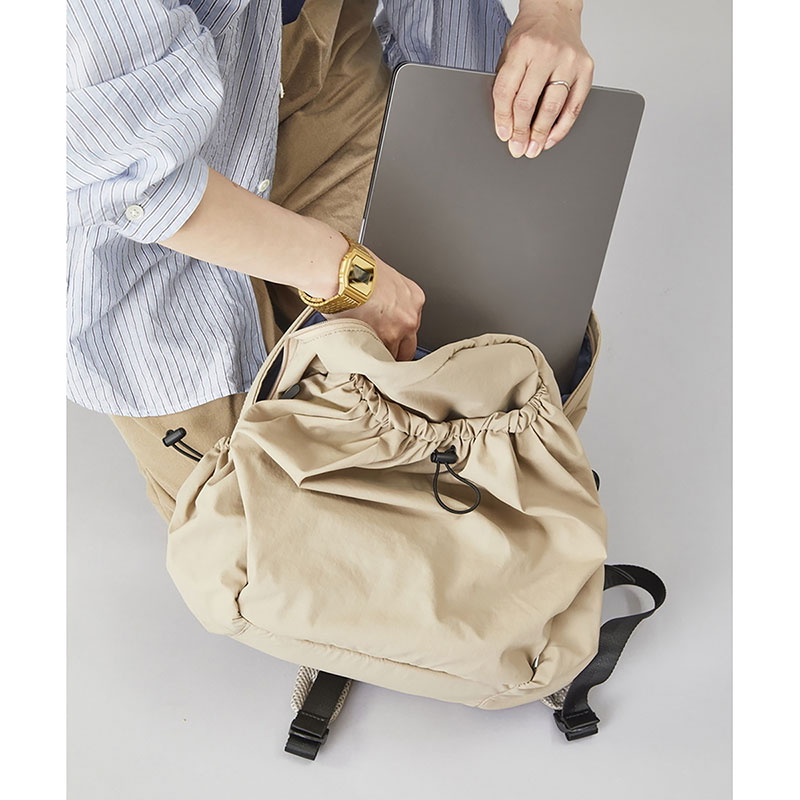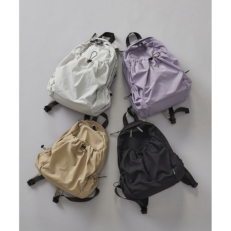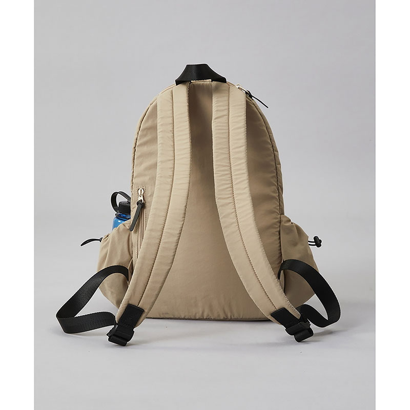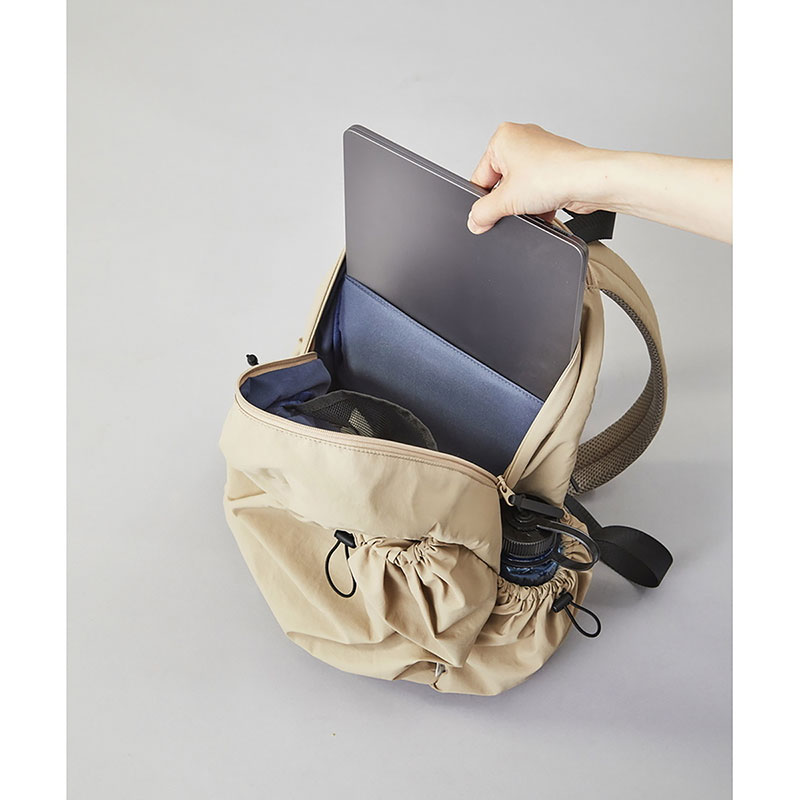 驚くほど軽い、撥水素材で雨の日も安心なリュックは、シンプルに見えて機能性抜群。表に5つのポケット、サイドにはペットボトル、背面には貴重品が入るファスナーポケット。鍵やイヤホンに便利な上部の小ポケットも。A4や13インチPC対応で、荷物が整理しやすいメッシュポケット付き。引き手がブラックで統一され、配色のアクセントが効いた大人カジュアルな一品です。