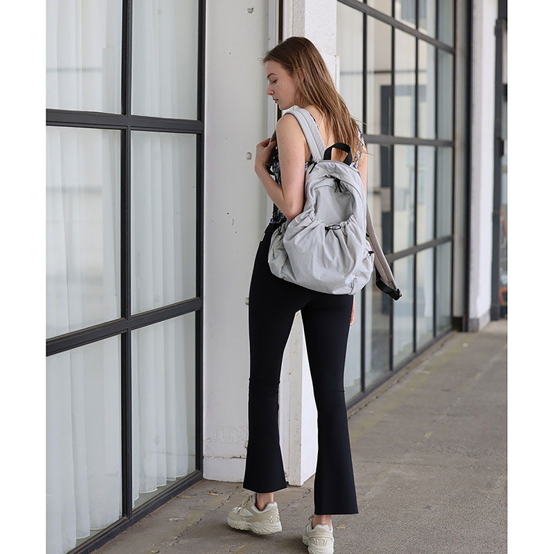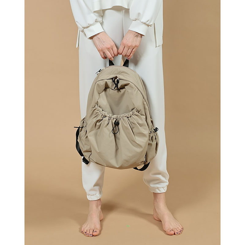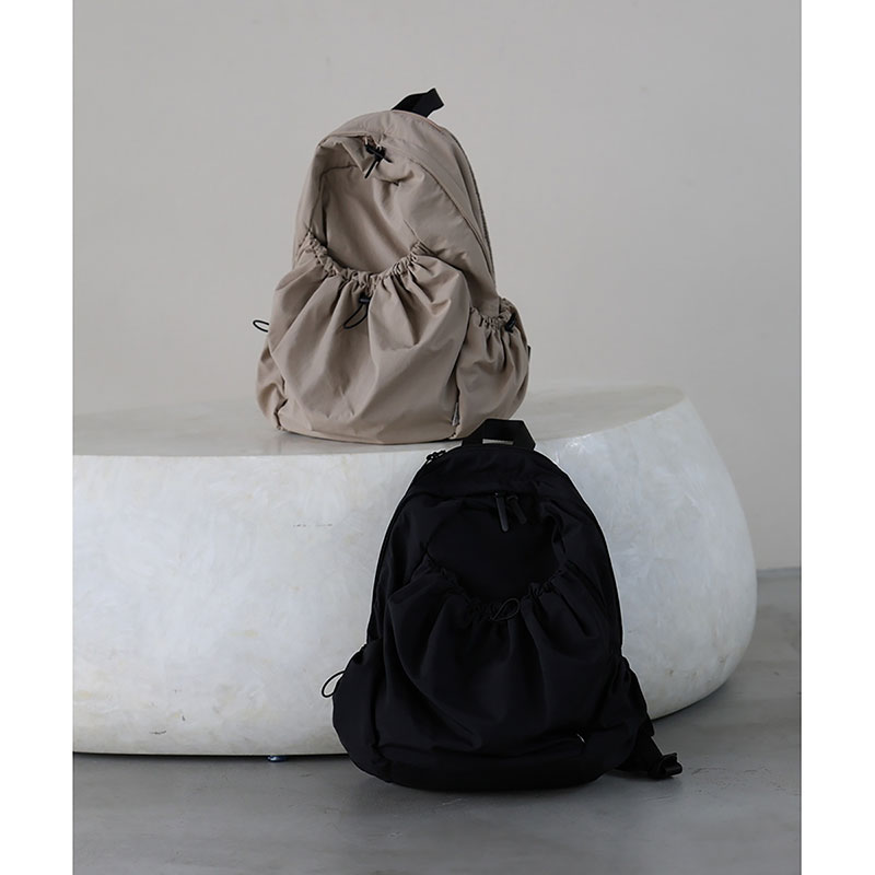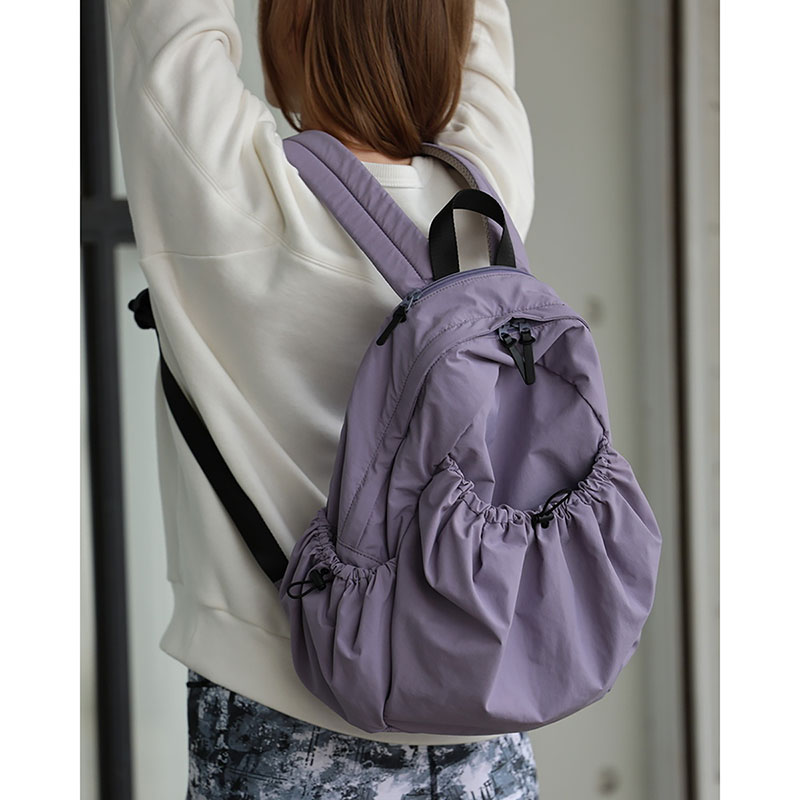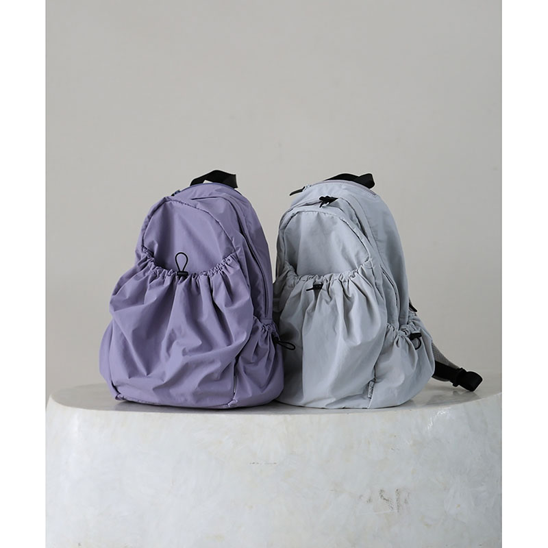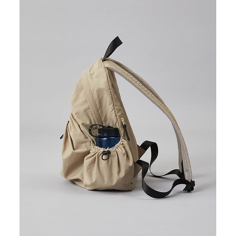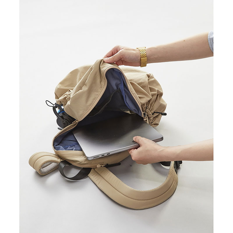 驚くほど軽い、撥水素材で雨の日も安心なリュックは、シンプルに見えて機能性抜群。表に5つのポケット、サイドにはペットボトル、背面には貴重品が入るファスナーポケット。鍵やイヤホンに便利な上部の小ポケットも。A4や13インチPC対応で、荷物が整理しやすいメッシュポケット付き。引き手がブラックで統一され、配色のアクセントが効いた大人カジュアルな一品です。