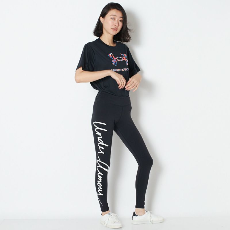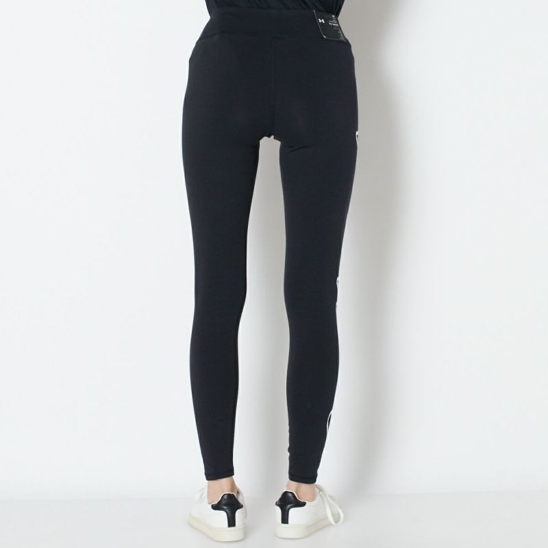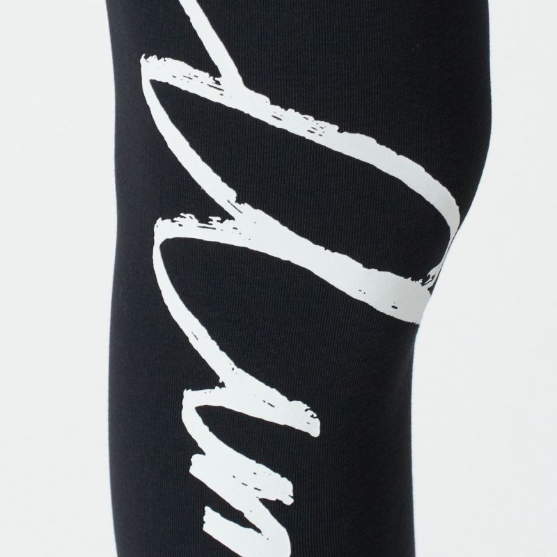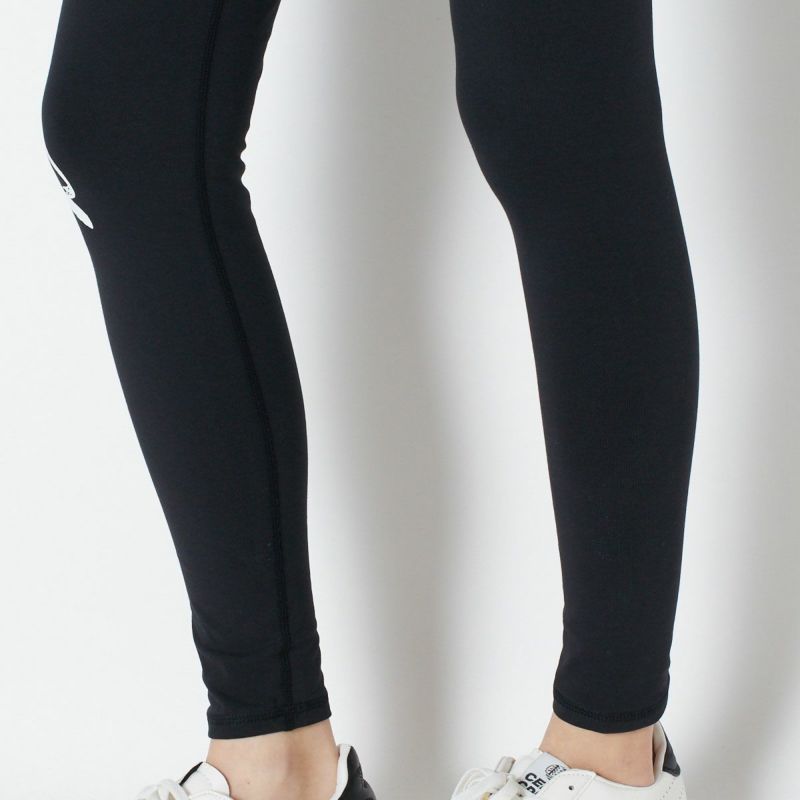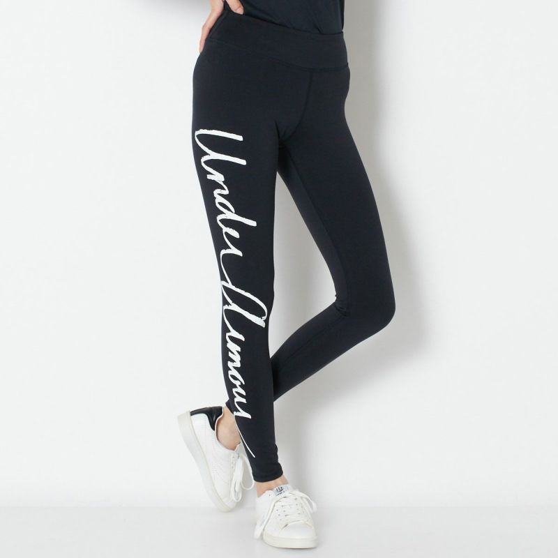 ペイント風のロゴプリントが目をひくフルレングスレギンス。モノトーンカラーでコーディネートに取り入れやすいアイテムです。コットンとポリエステルを混紡したストレッチカットソー素材は、透けにくくストレッチ性に優れて引き締め効果も抜群です。