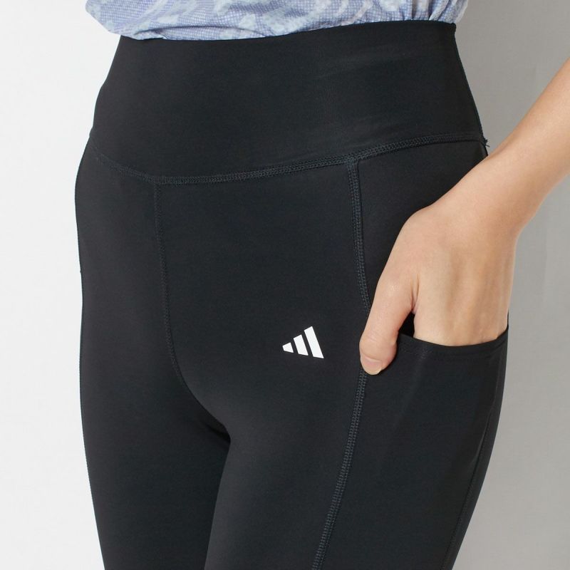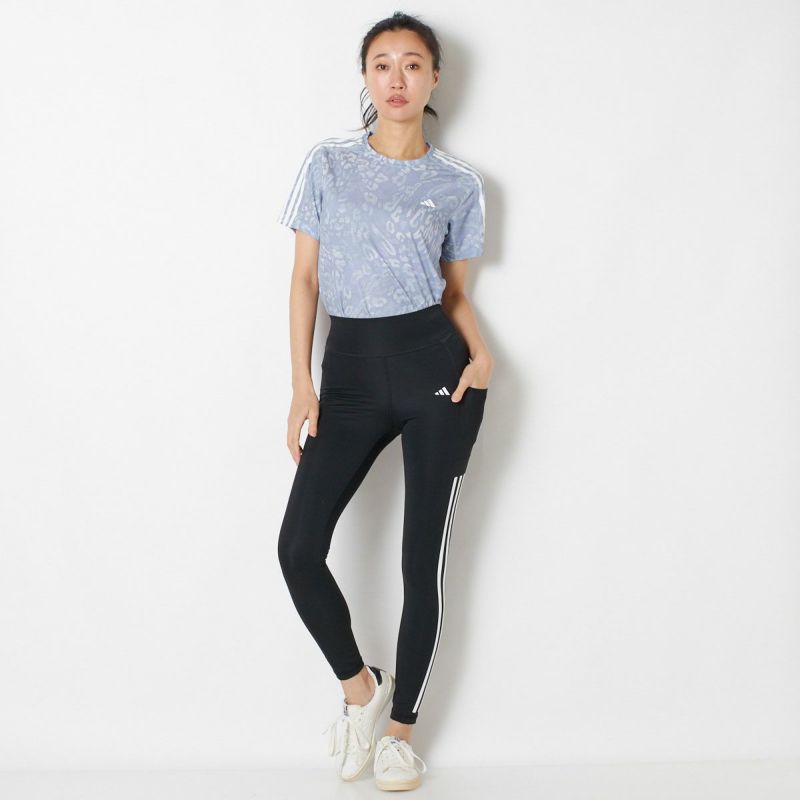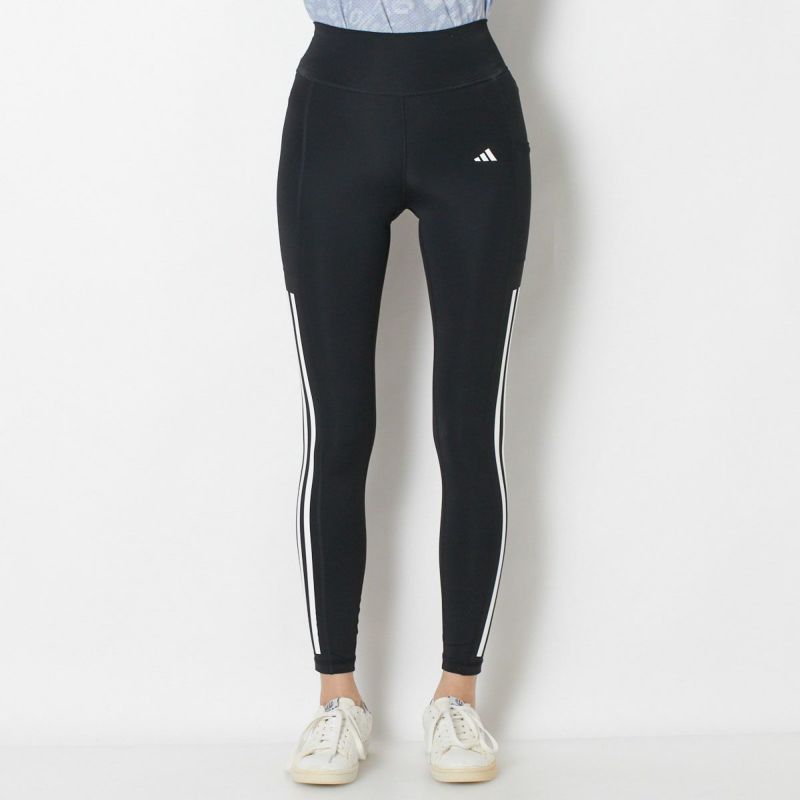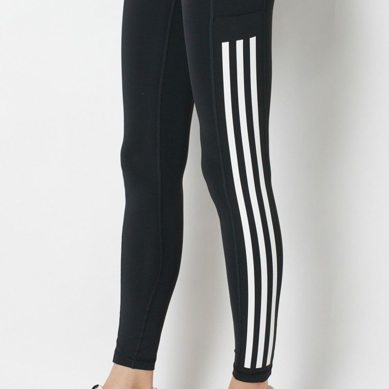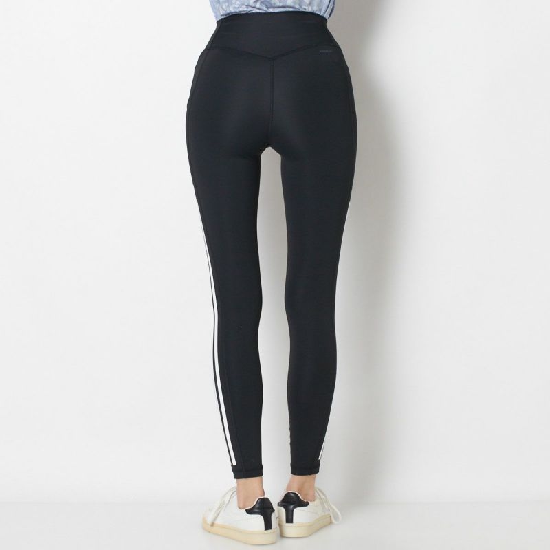 両サイドにスリーストライプのプリントをあしらったレギンス。艶のあるストレッチポリエステル素材で仕立てた、しなやかで伸びの良い一枚です。お腹をしっかりホールドしてくれるハイウエストめの切り替えデザインで、締め付け感なく着用できるのも魅力。左腿部分にはスマートフォンなど携行品が入るポケット付き。