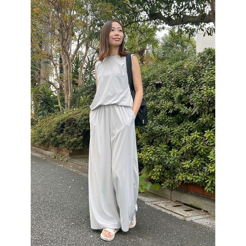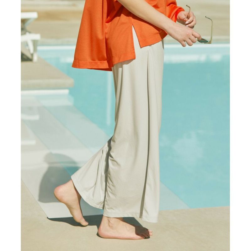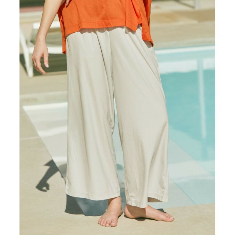 耐久性、吸水性、速乾性を併せ持つ高パフォーマンス生地のイージーパンツです。捨てられる前の素材を使用したエコ素材は、スエードの風合いをもちあわせ、なめらかな質感で肌触りが良く、高級感を演出できる上質な素材です。ウエスト部分は、ドロストが付いたオールゴム仕様です。リラックス感のあるフォルムと軽やかな穿き心地で、毎日穿きたくなる一品。同素材のトップスと合わせてオールインワンのようなコーディネートがおすすめです。