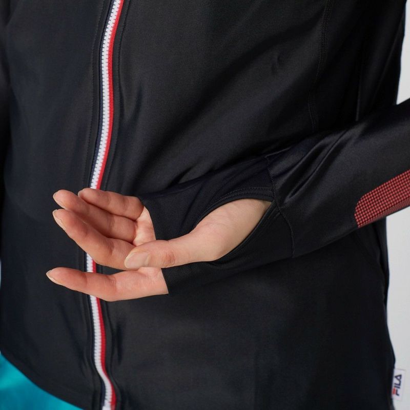 カラーファスナーの肌側部分は、ファスナーガードが付いていて安全です。パーカー襟ぐりはスピンドルで調節可能。指穴仕様。