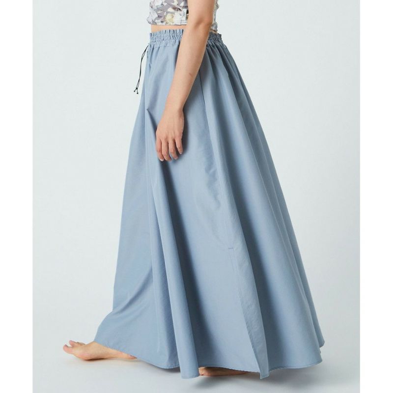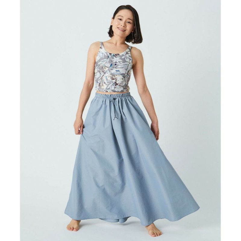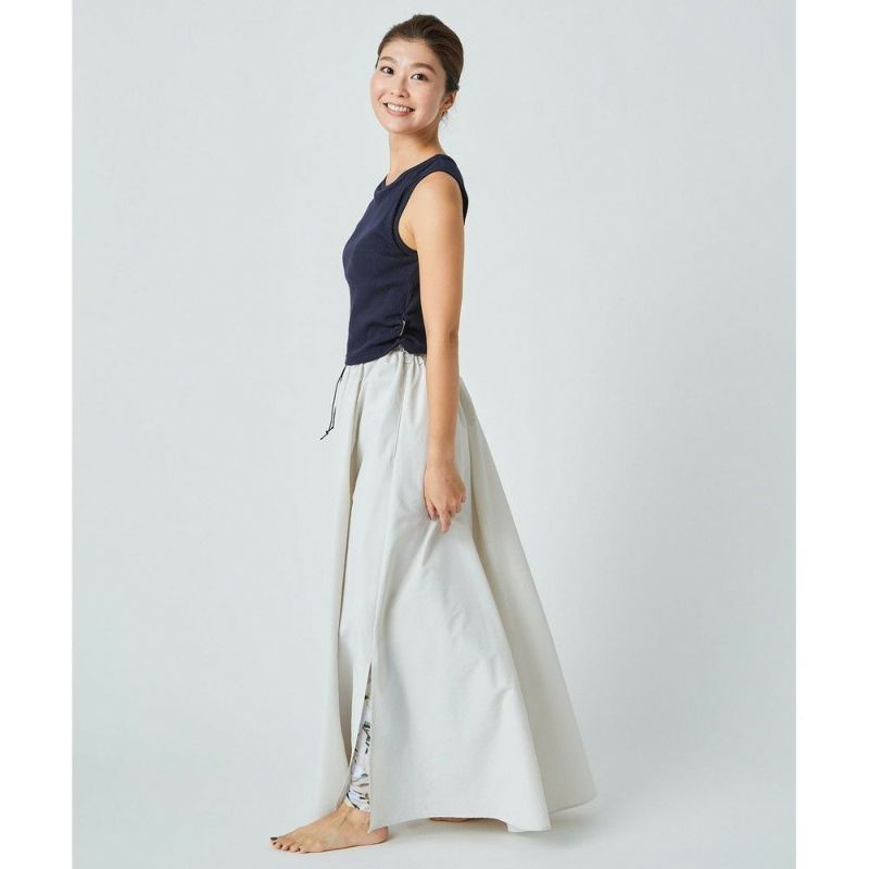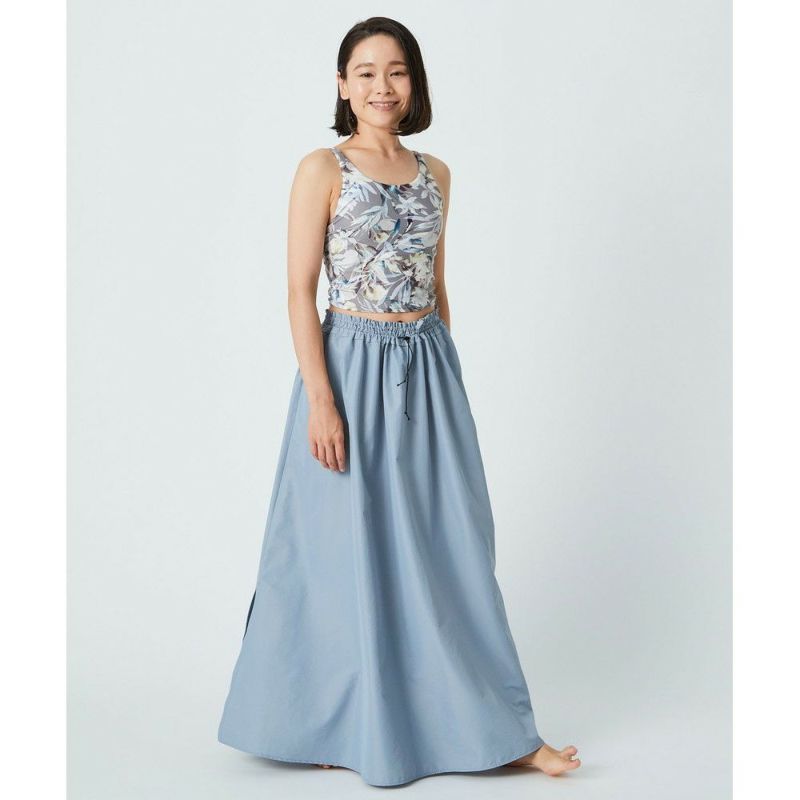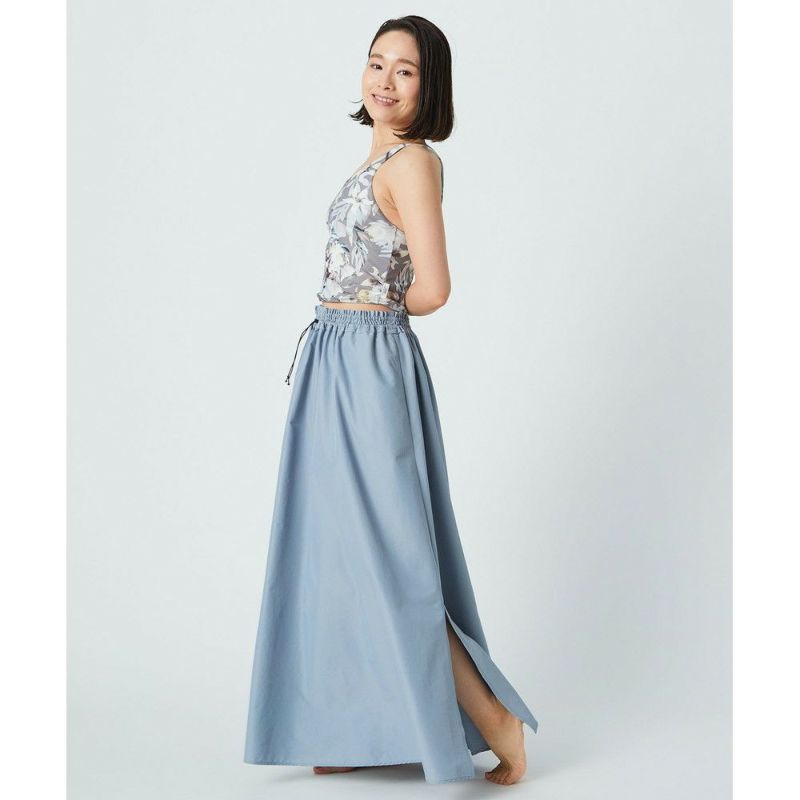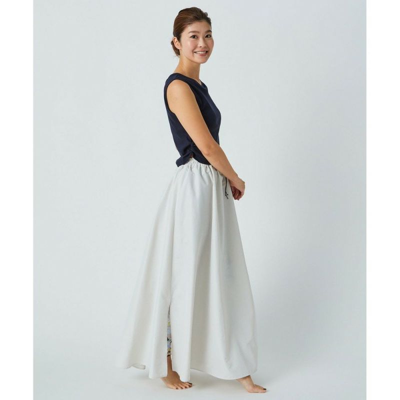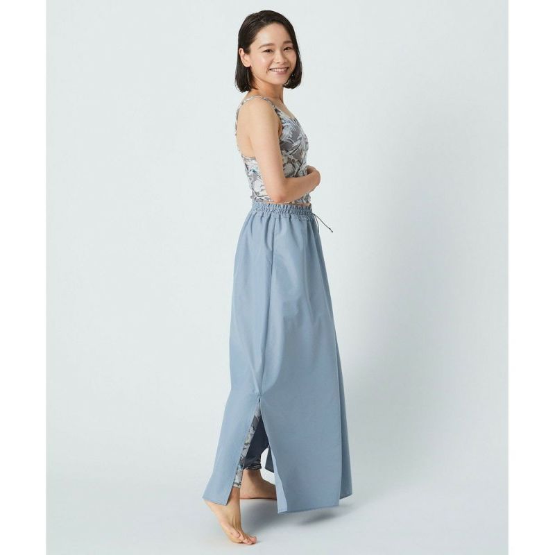 脇のスリットが軽やかな印象のマキシ丈スカート。ウエストは紐で絞ることができ、お好きな箇所で止めていただけます。ワークアウトの行き帰りにヨガウェアの上からさっと履いて、スリットからレギンスを見せる着こなしもおすすめです。撥水性のあるスカートは梅雨時期にも重宝します。