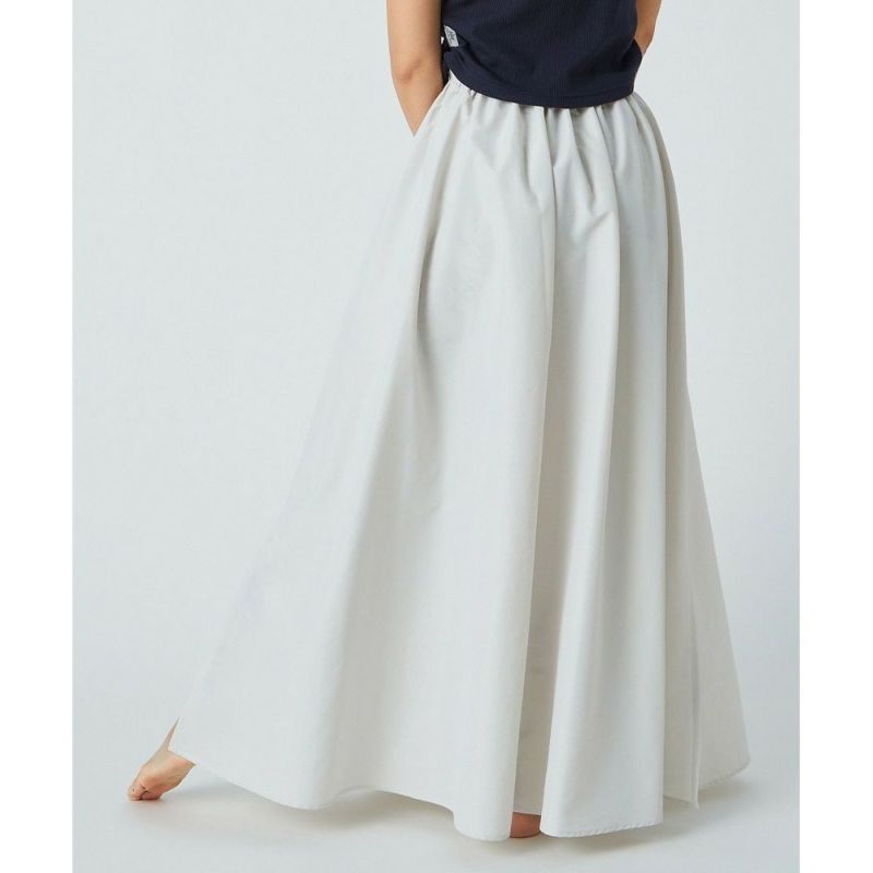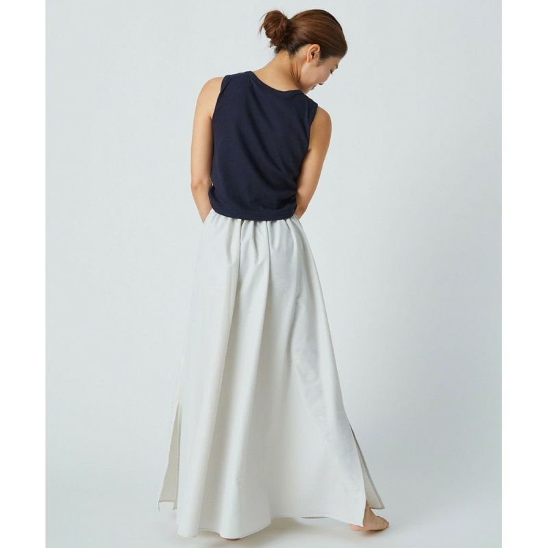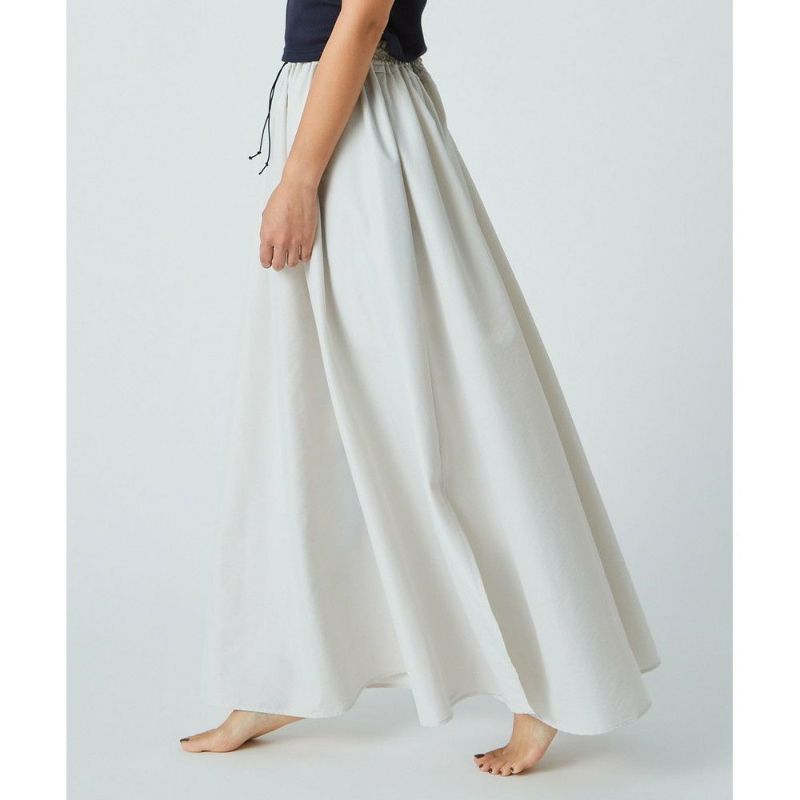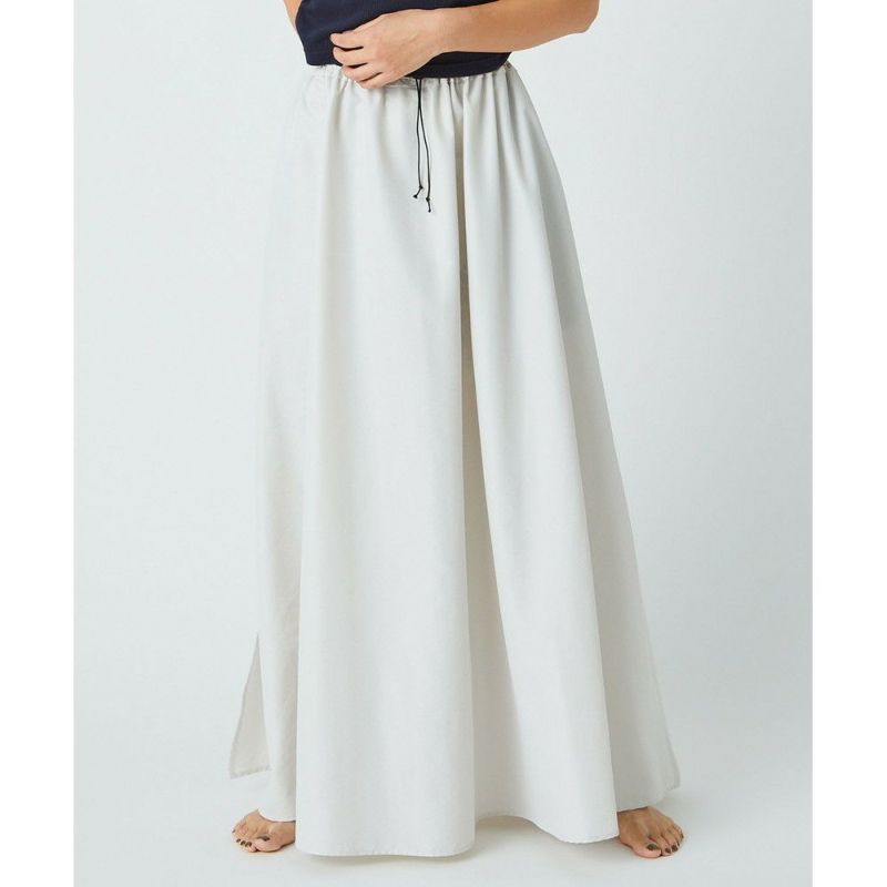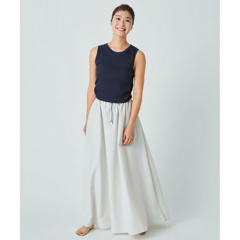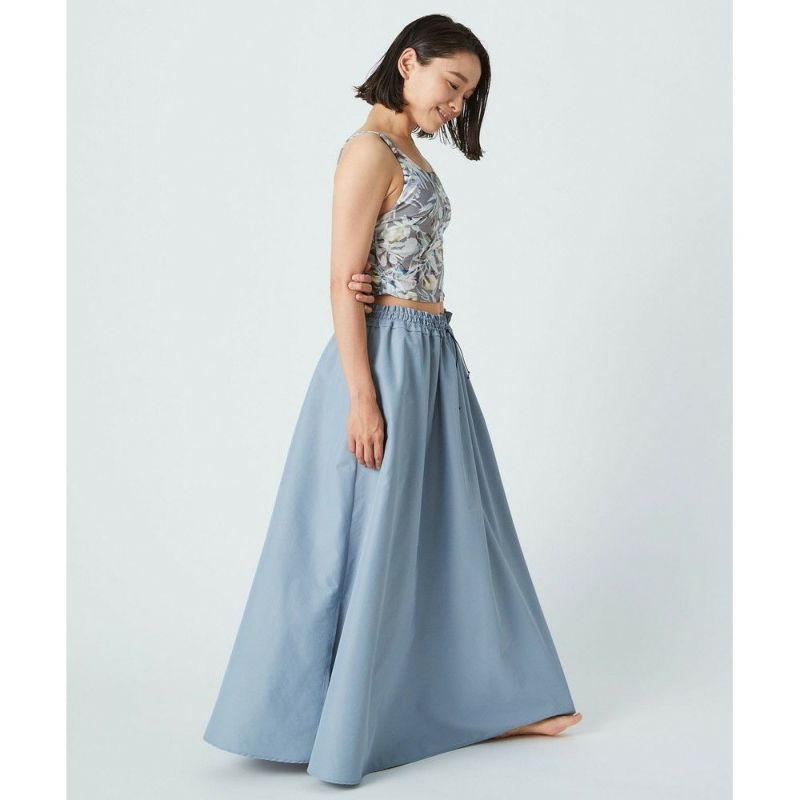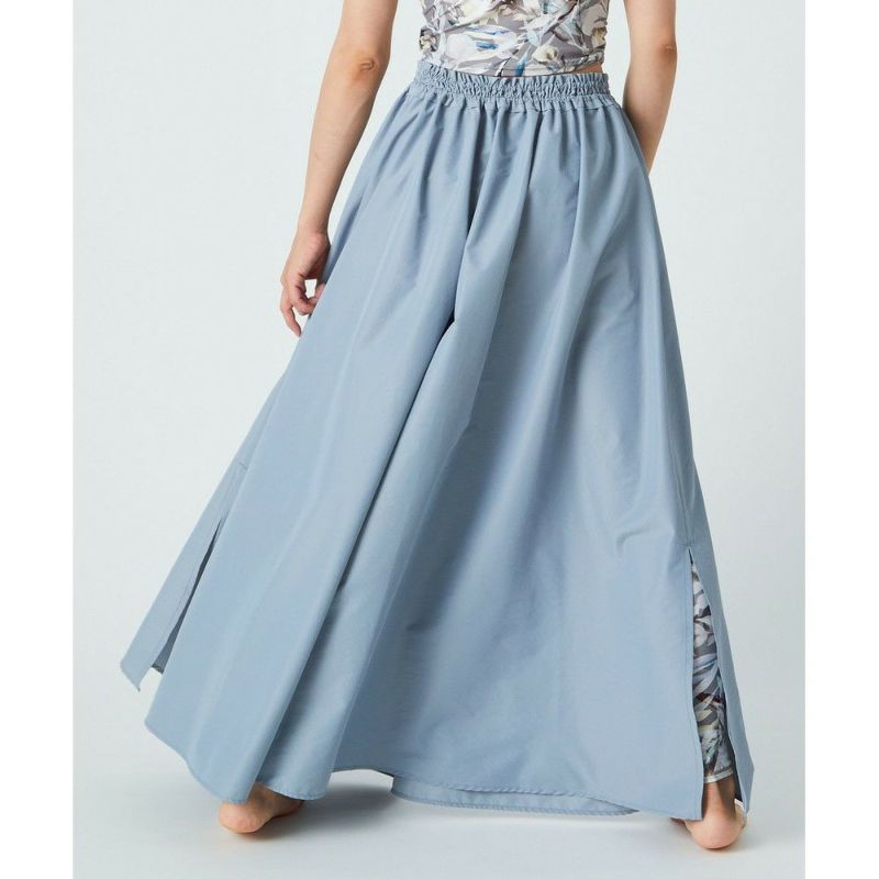 脇のスリットが軽やかな印象のマキシ丈スカート。ウエストは紐で絞ることができ、お好きな箇所で止めていただけます。ワークアウトの行き帰りにヨガウェアの上からさっと履いて、スリットからレギンスを見せる着こなしもおすすめです。撥水性のあるスカートは梅雨時期にも重宝します。