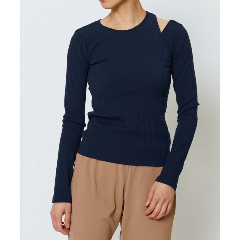 julier定番のリブ素材に新デザインが登場。アシンメトリーなカッティングにこだわり、ヘルシーな肌見せができるデザイン。パット付きで便利な1枚です。