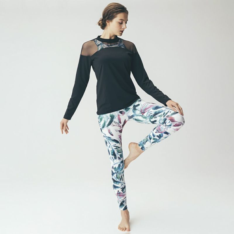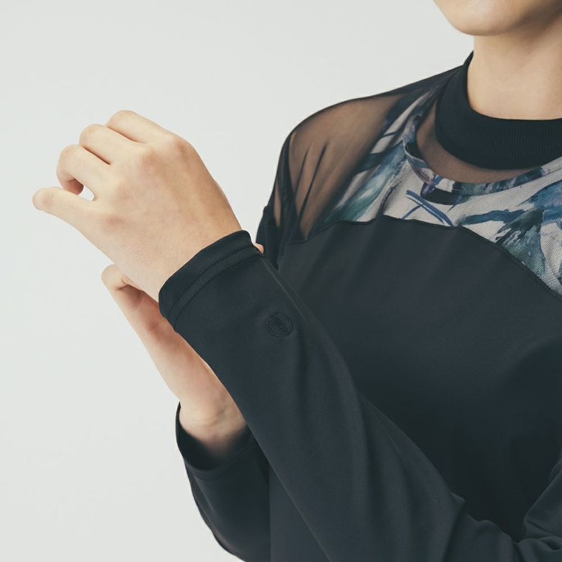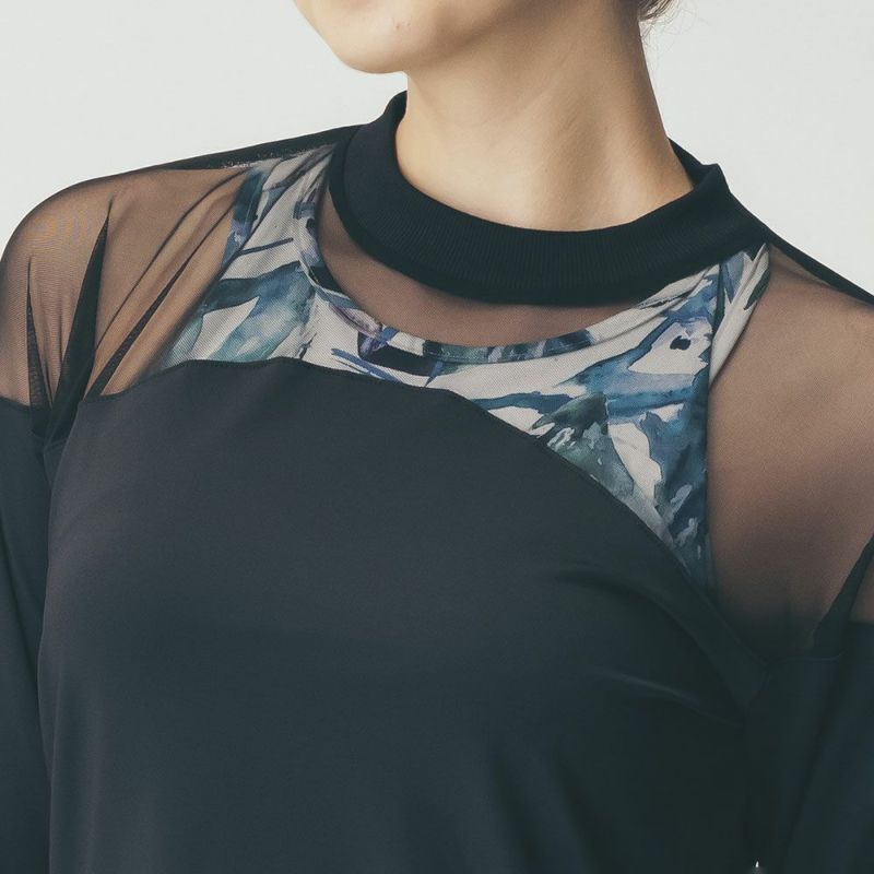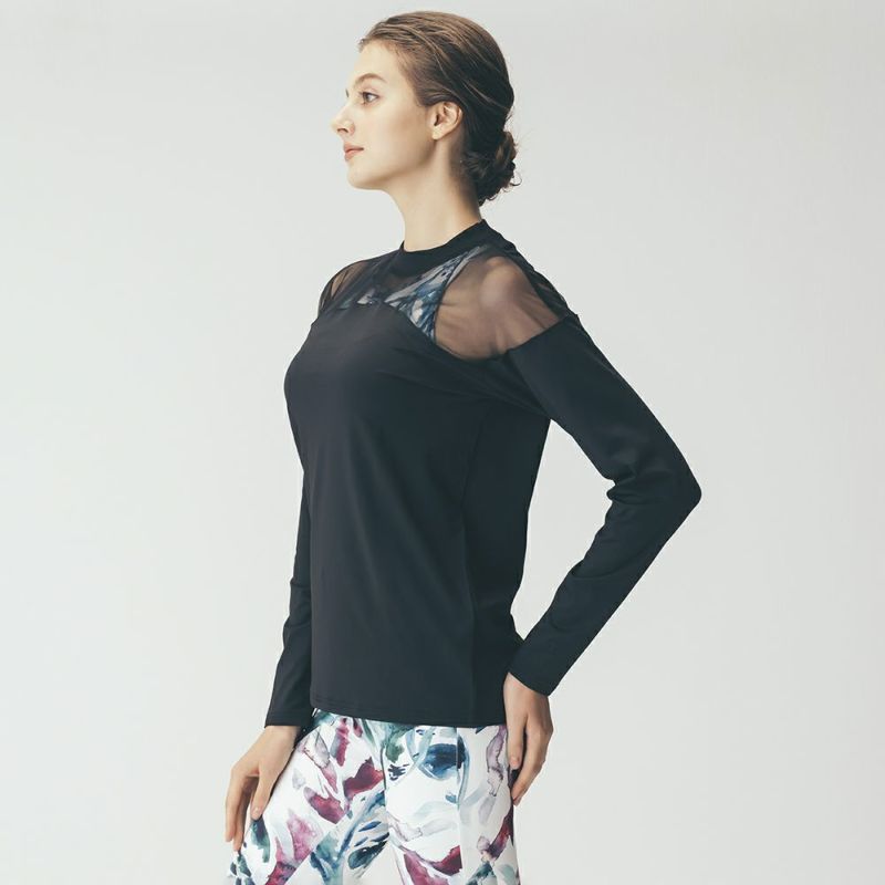 肩周りがチュール切替になったカットソー。透け感のある適度な肌見せで女性らしい印象になります。お尻までかかる丈感で、レッスン中はもちろん行き帰りにもおすすめです。薄手の素材でストレッチ性が高く着心地も快適です。デザインは人気ファッションブランドDOUBLE STANDARD CLOTHINGが監修しています。