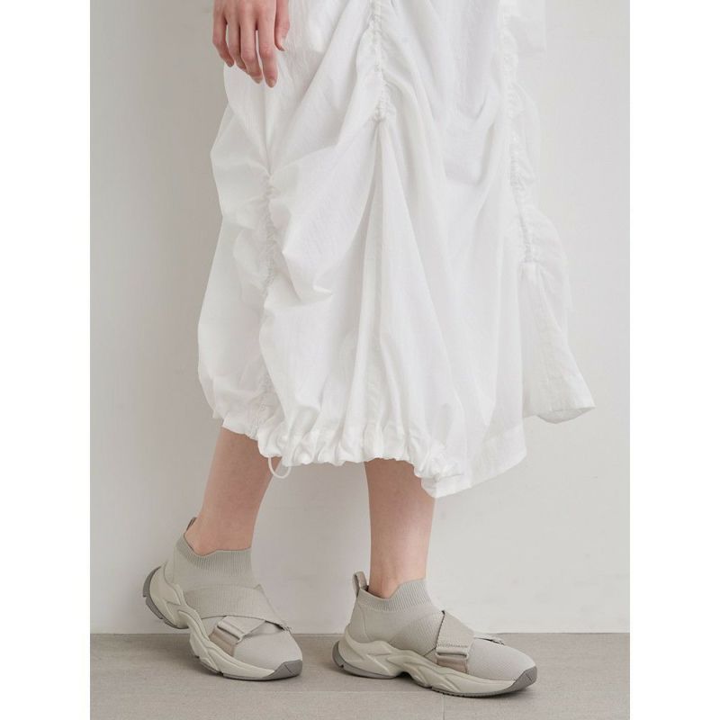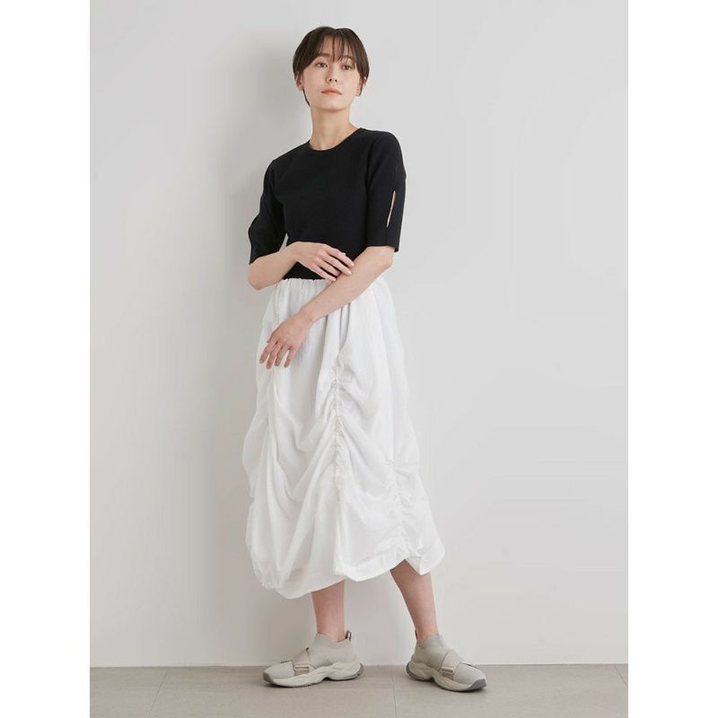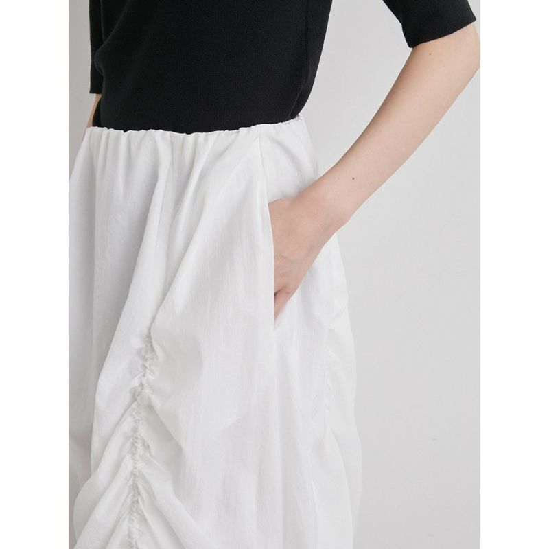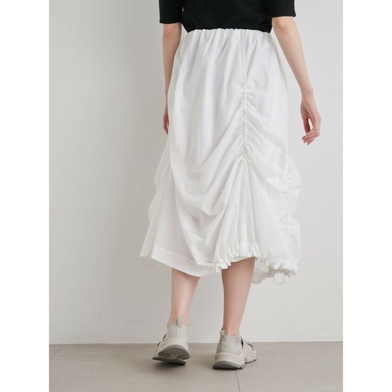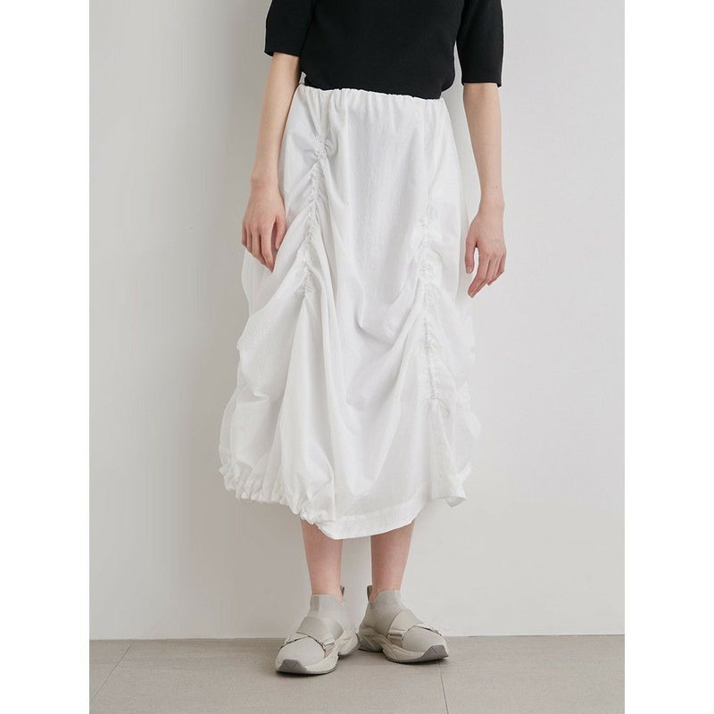要所に施されたシャーリングディティールが存在感を放つスカート。サイドはドロスト仕様になるので、丈の調節も可能です。コーディネートのメインとして活躍するデザイン性の高いアイテムで、1枚着用するだけでトレンド感抜群の仕上がりが楽しめます。撥水加工、ハンドウォッシャブル可能な機能性も抜群のアイテム。