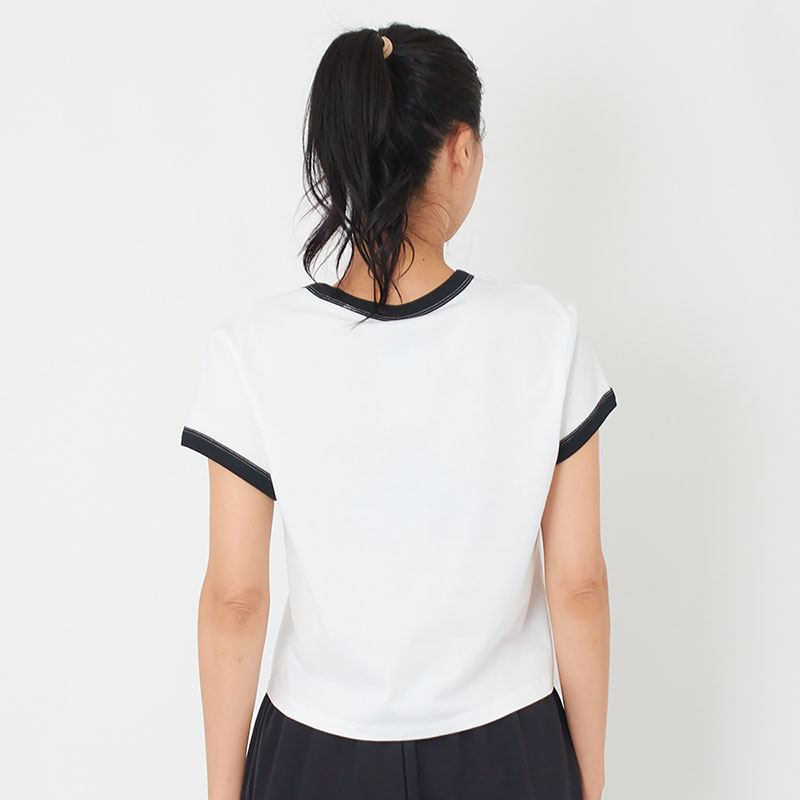 襟ぐりと袖口の配色切り替えデザインが目を引くTシャツ。肌触りの良いコットン素材のカットソー生地で仕立てた、運動時はもちろんタウンユースにもおすすめの一枚です。コンパクトな丈感とボディラインを拾わないゆとりのあるシルエットで、今っぽい着こなしが叶います。