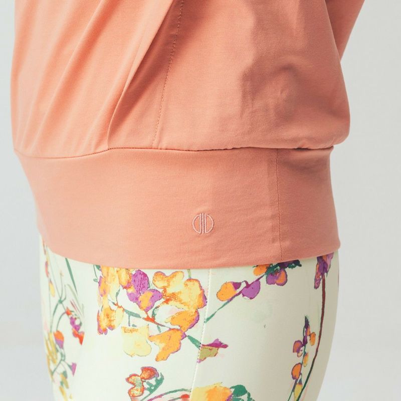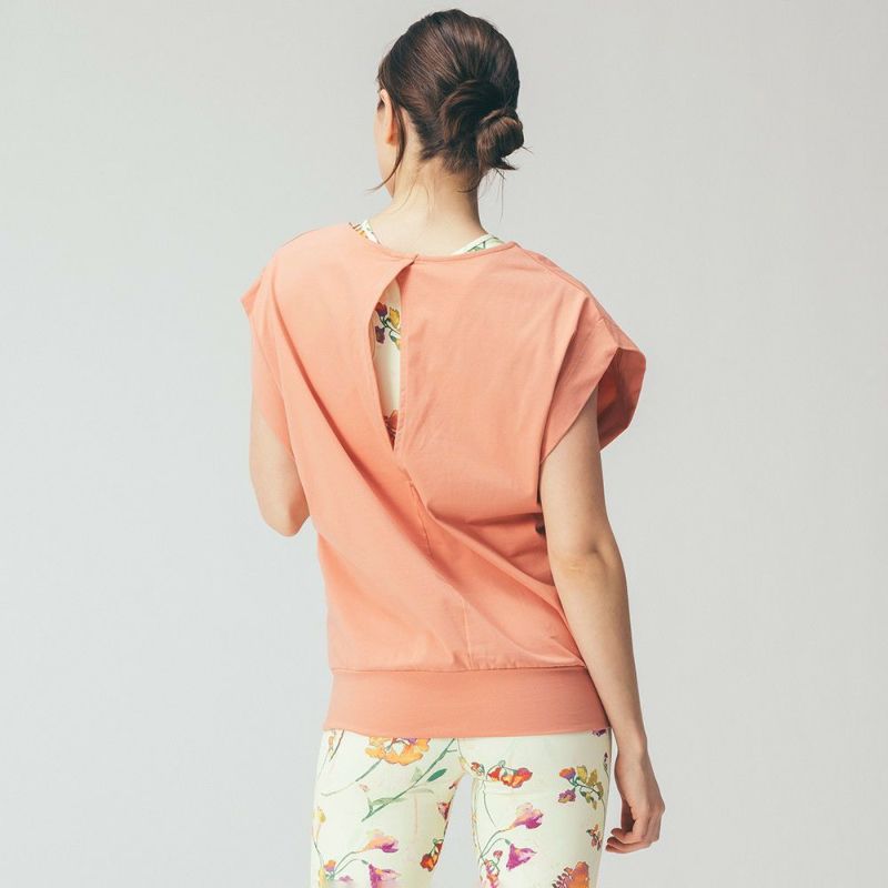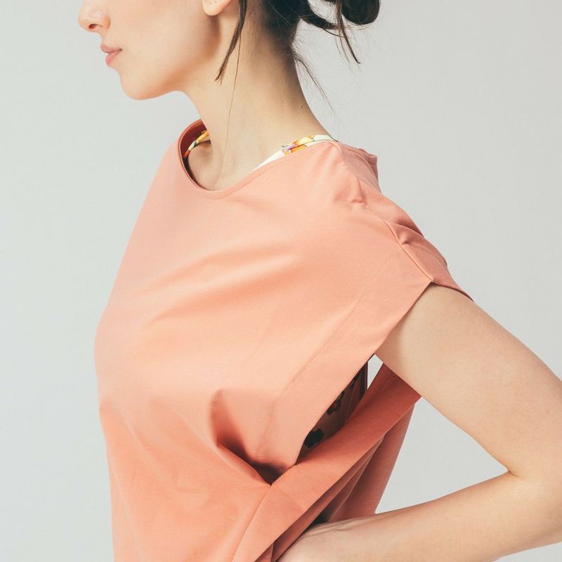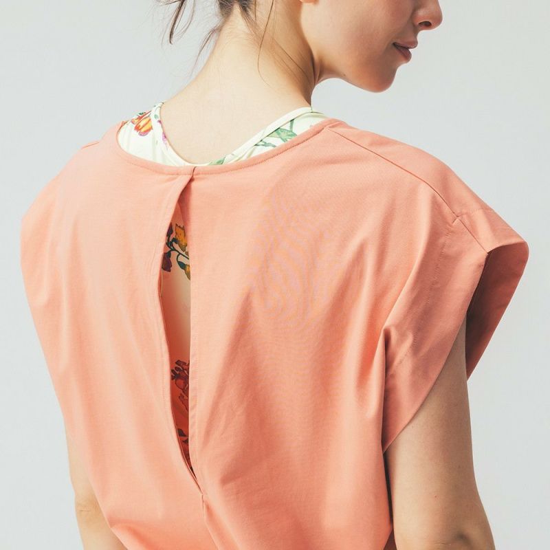 伸びのよいコットンストレッチ素材を使用したデザイントップス。二の腕をさりげなくカバーする肩のデザインやお尻までカバーできる丈感のゆったりとしたシルエットです。背中と脇のあきからインナーをのぞかせてレイヤードで着ていただけます。ヨガウェアの上からばさっと着られるのでレッスンの行き帰りにもおすすめです。差し色にぴったりな明るいカラーで、春らしいミントと、ポジティブな印象のオレンジの2色展開です。デザインはDOUBLE STANDARD CLOTHINGが監修しています。