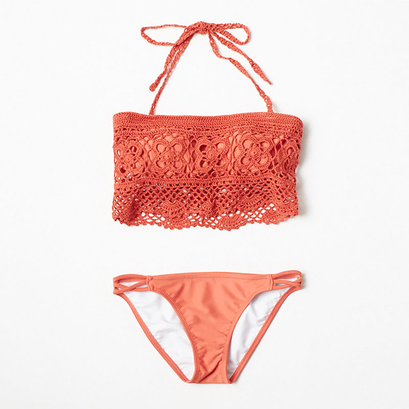 花モチーフのかぎ針編みの透け感がフェミニンなビキニ。ショーツはサイドのクロスデザインがアクセントに効いたシンプルな無地です。他の水着と組み合わせてのスタイリングもおすすめです。ショルダーストラップは取り外し可能です。