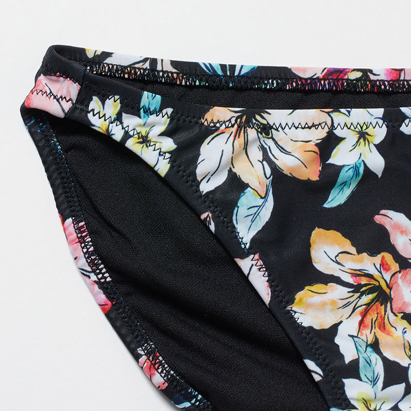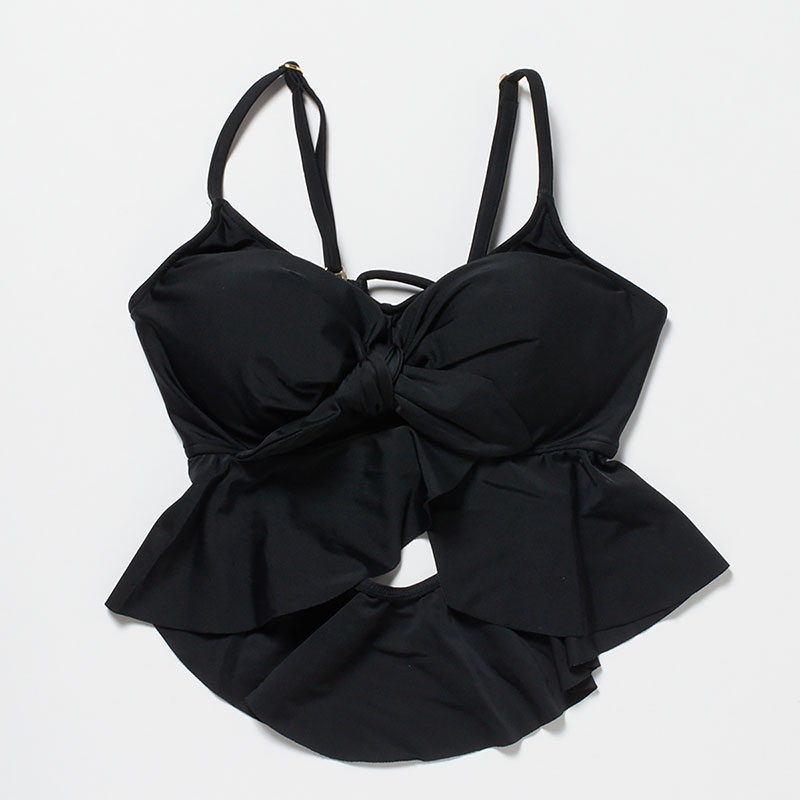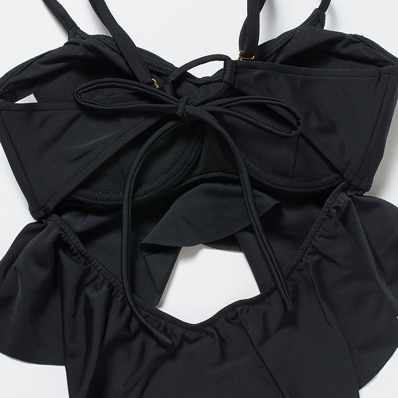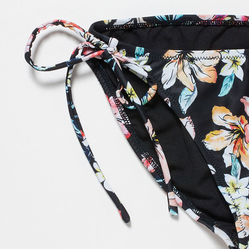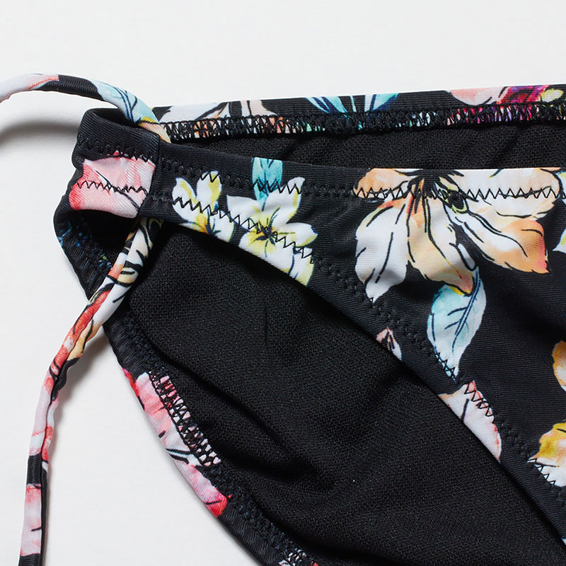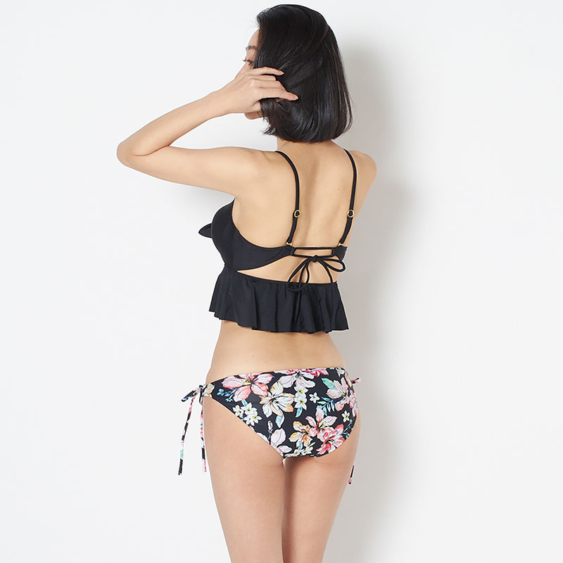 前後差のあるフリルが大人可愛いビスチェと、フラワープリントショーツのビキニ。リボンタイプのバックデザインが視線を誘う、どの方向から見ても隙のないデザインが魅力です。アンダーバストはワイヤーが入っているのでしっかりと胸の形をキープしてくれます。ショーツのリボンは取り外しが可能なので、好みに合わせた着こなしが叶います。