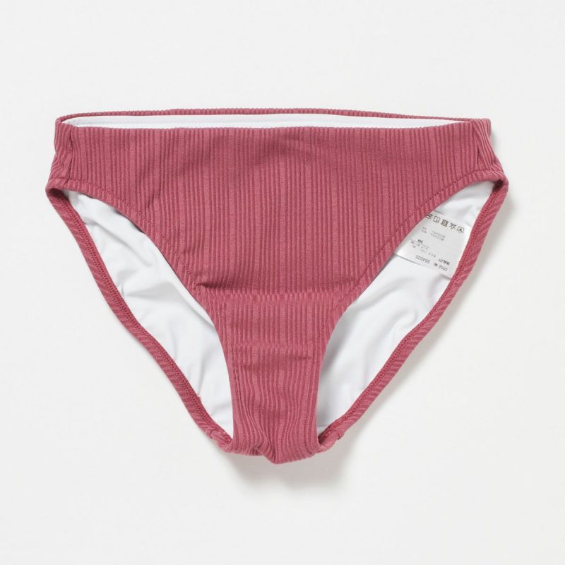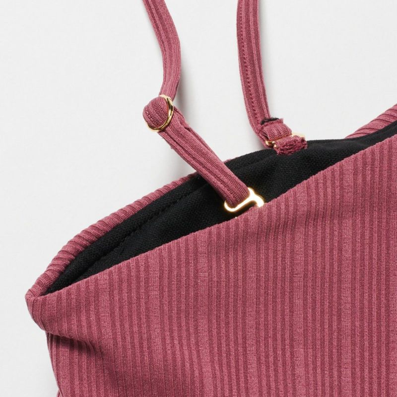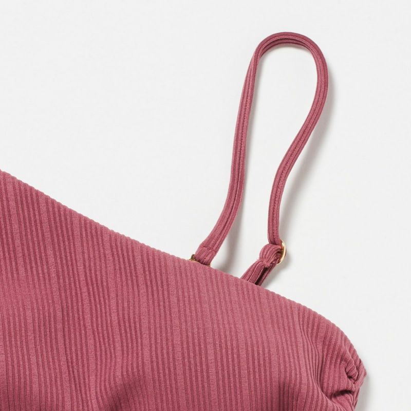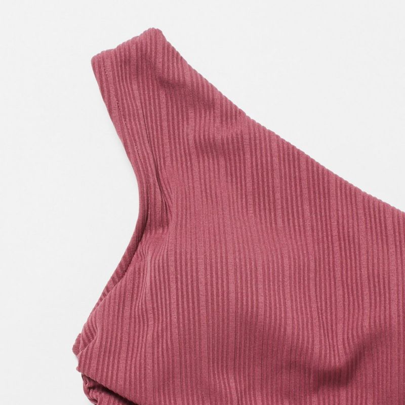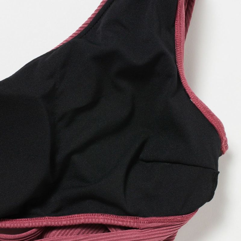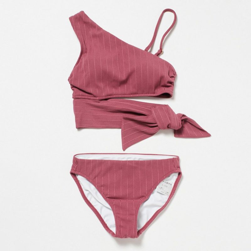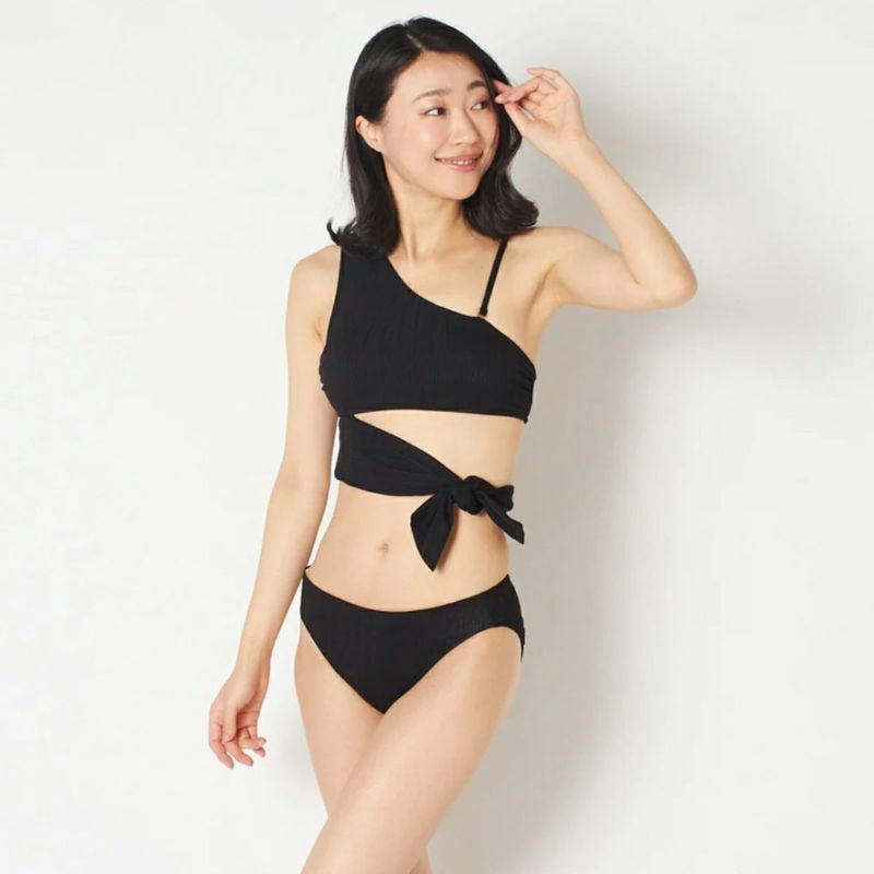 トレンドのリブ素材×ワンショルダーデザインを合わせたオシャレなビキニ。洋服感覚で着られるブラトップスと少し太めのショーツで安心感もあります。個性的なデザインで周りと差をつけたい方にもオススメのアイテムです。アンダーバストのリボンはブラトップスとドッキングしています。
